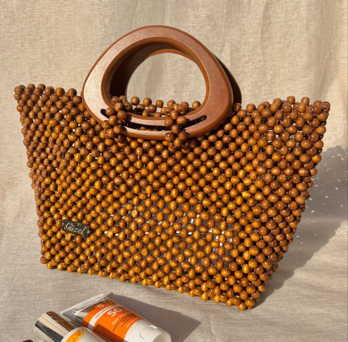 Beach bag made of wood grains, jumbo size, base size 21 cm x 21 cm height. The bag has an opening of 40 cm and has 2 oval handles