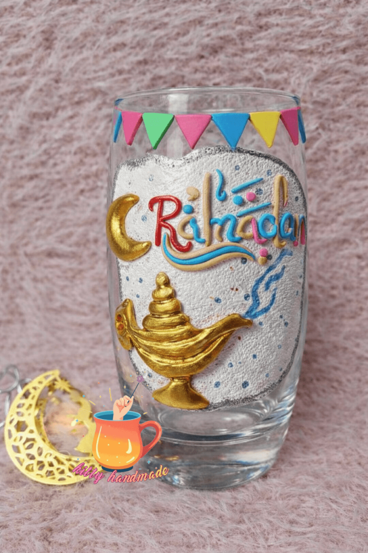 Ramadan glass with a polymer clay design. Usage instructions: Do not microwave or dishwasher safe. Do not leave in a basin of water.
