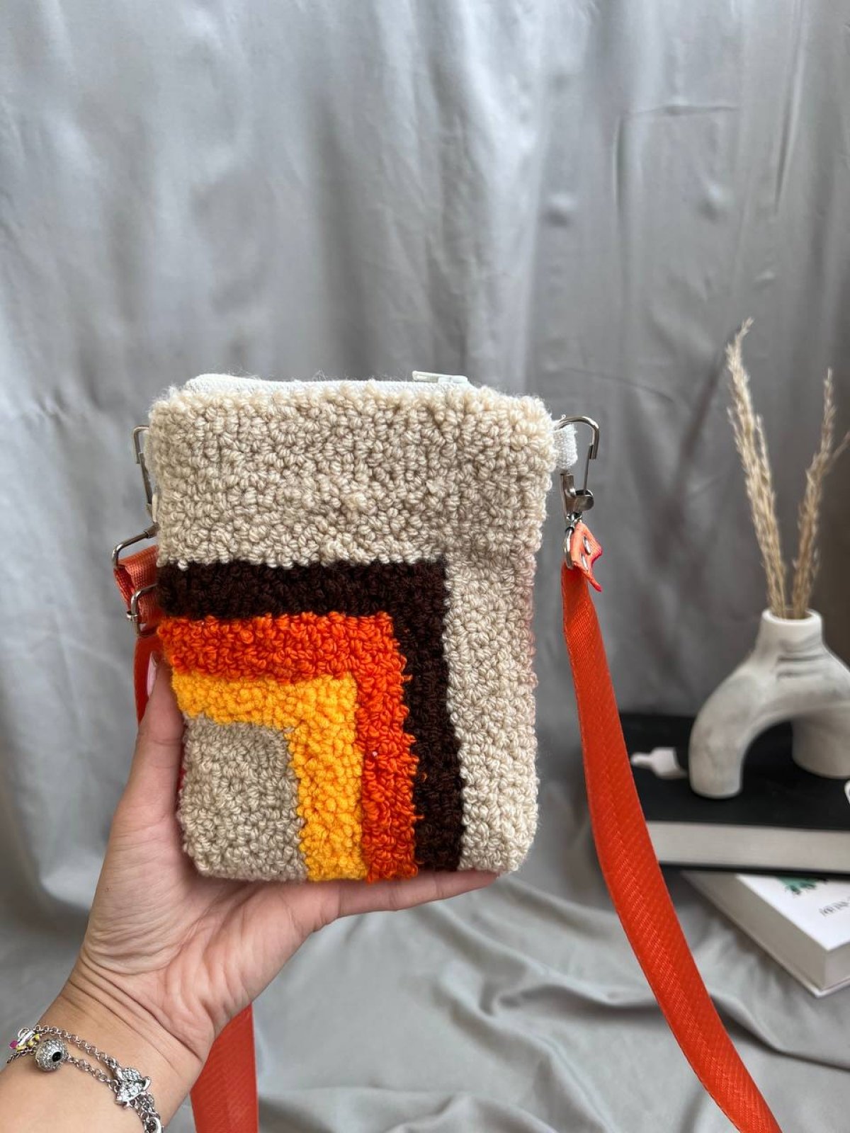 شنطة موبايل كروس هاند ميد 100% 🧵 تصميم هندسي مميز ألوان دافية: بيج × بني × برتقالي × موستارد تفصيلة شيك وتليق مع لبس الخريف والشتا 🍂