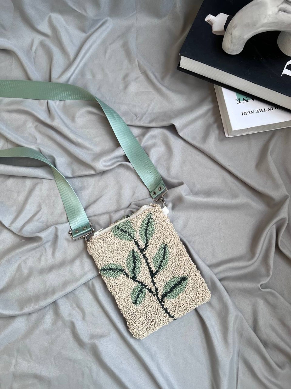 شنطة موبايل كروس هاند ميد 100% 🧵 تصميم أوراق طبيعي بألوان بيج وأخضر هادي تفصيلة مريحة للعين وتكمل أي لوك كاجوال ✨