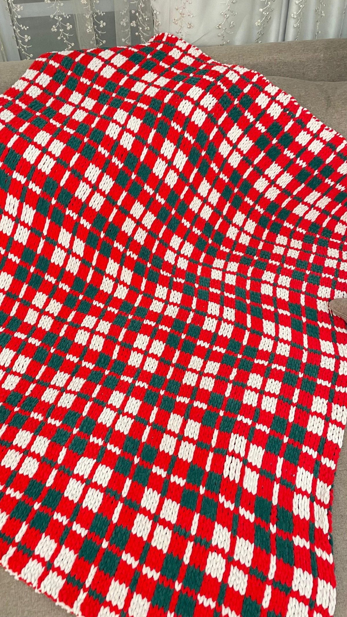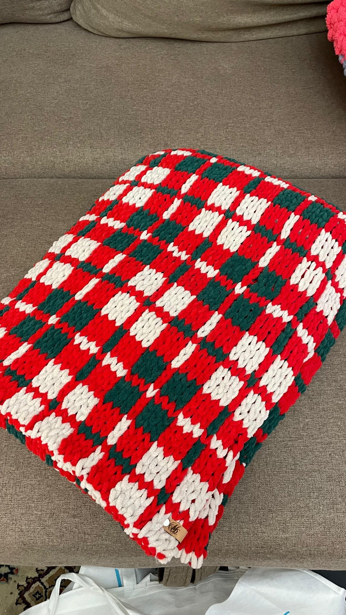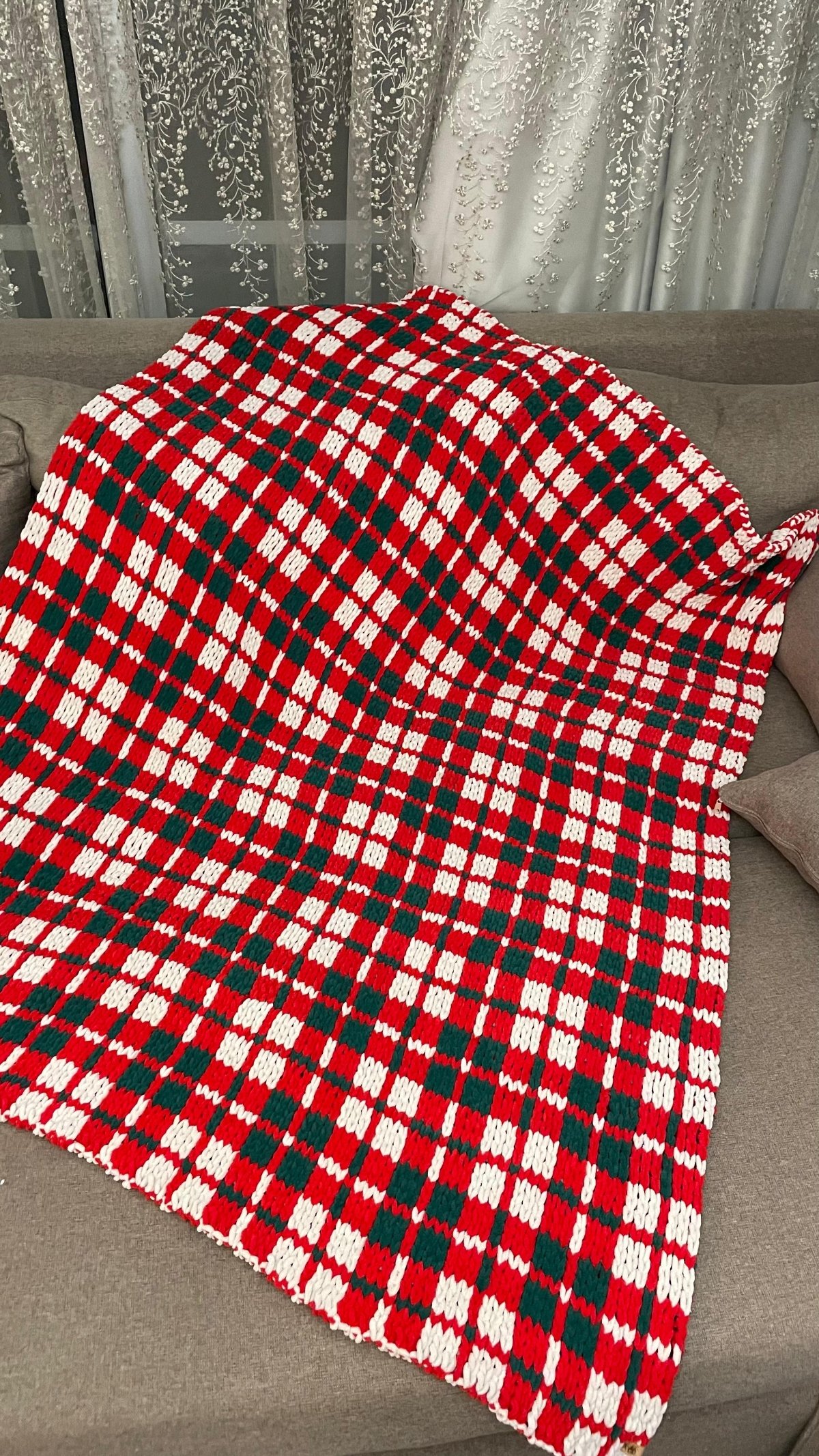 Red and green plaid hand knitted blanket made from soft velvet yarn Size 140x180 cm