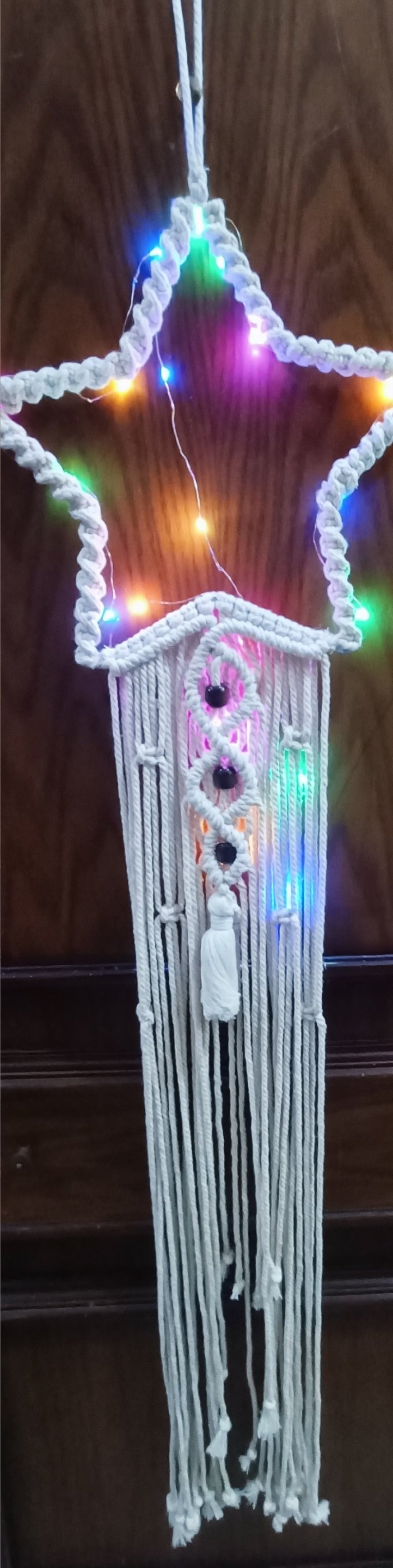 Ramadan decoration in the shape of a star, off-white in color, embellished with beads and featuring an LED.
