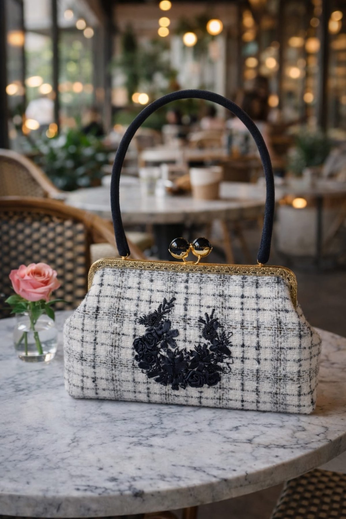 Premium Wool Embroidered Bag with Satin Ribbons, Elegant Metal Frame & Natural Suede Handle size:6*26*15