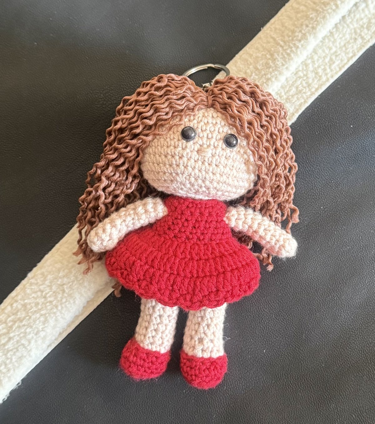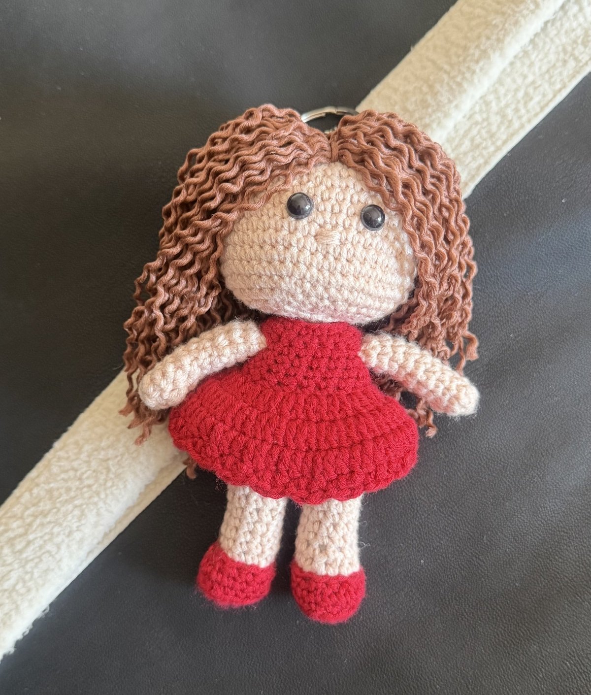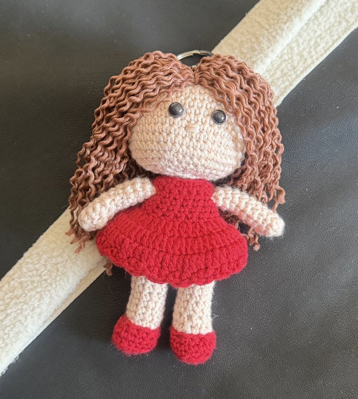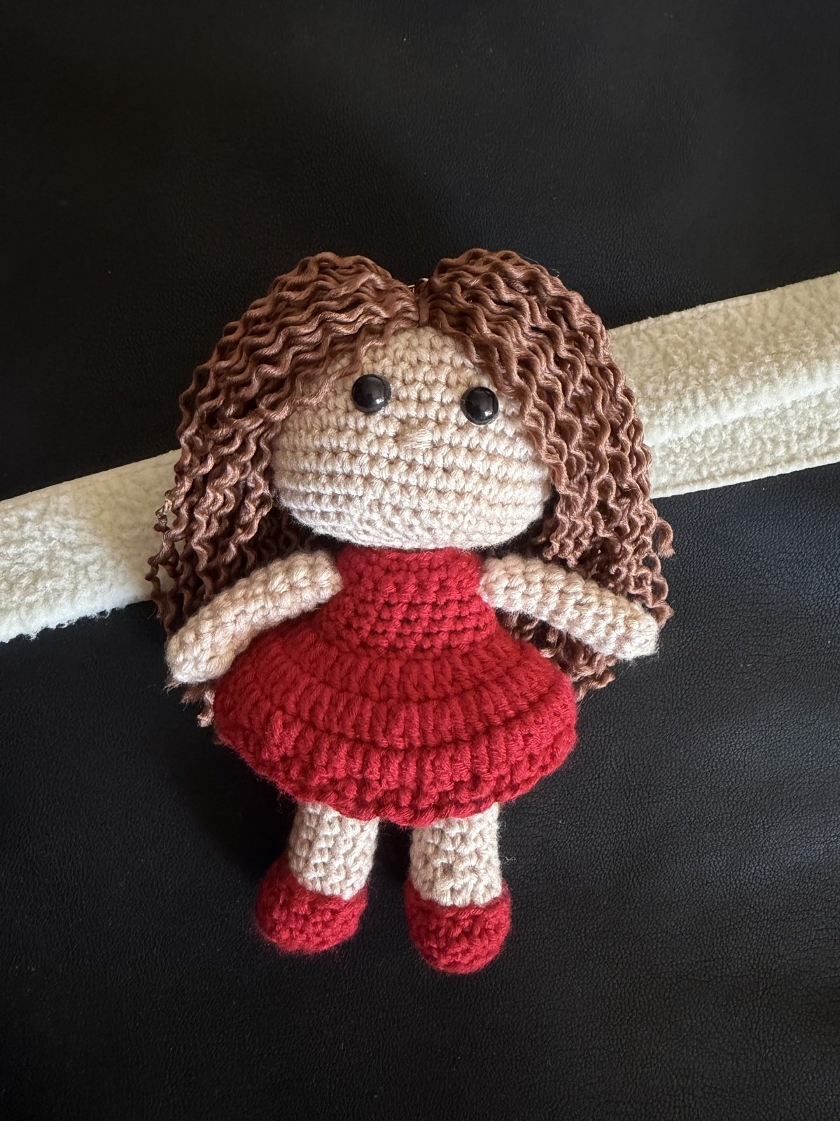 A high-strung amigurumi bride, wearing a red dress and red shoes with a medallion ring in her head.