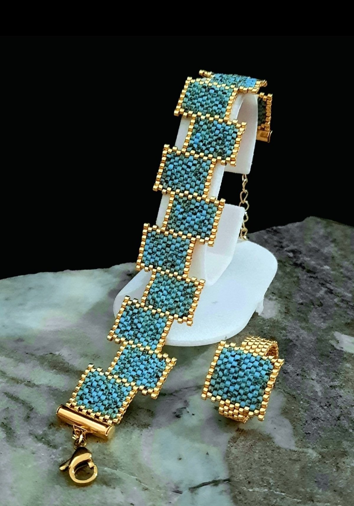 The set includes a bracelet with a series of turquoise rectangles and gold-tone edges, featuring an elegant, attractive, and unique design. It also includes a ring with a single rectangular design in the same style. All metals used are rust-proof, colorfast, and hypoallergenic. They are also very lightweight.