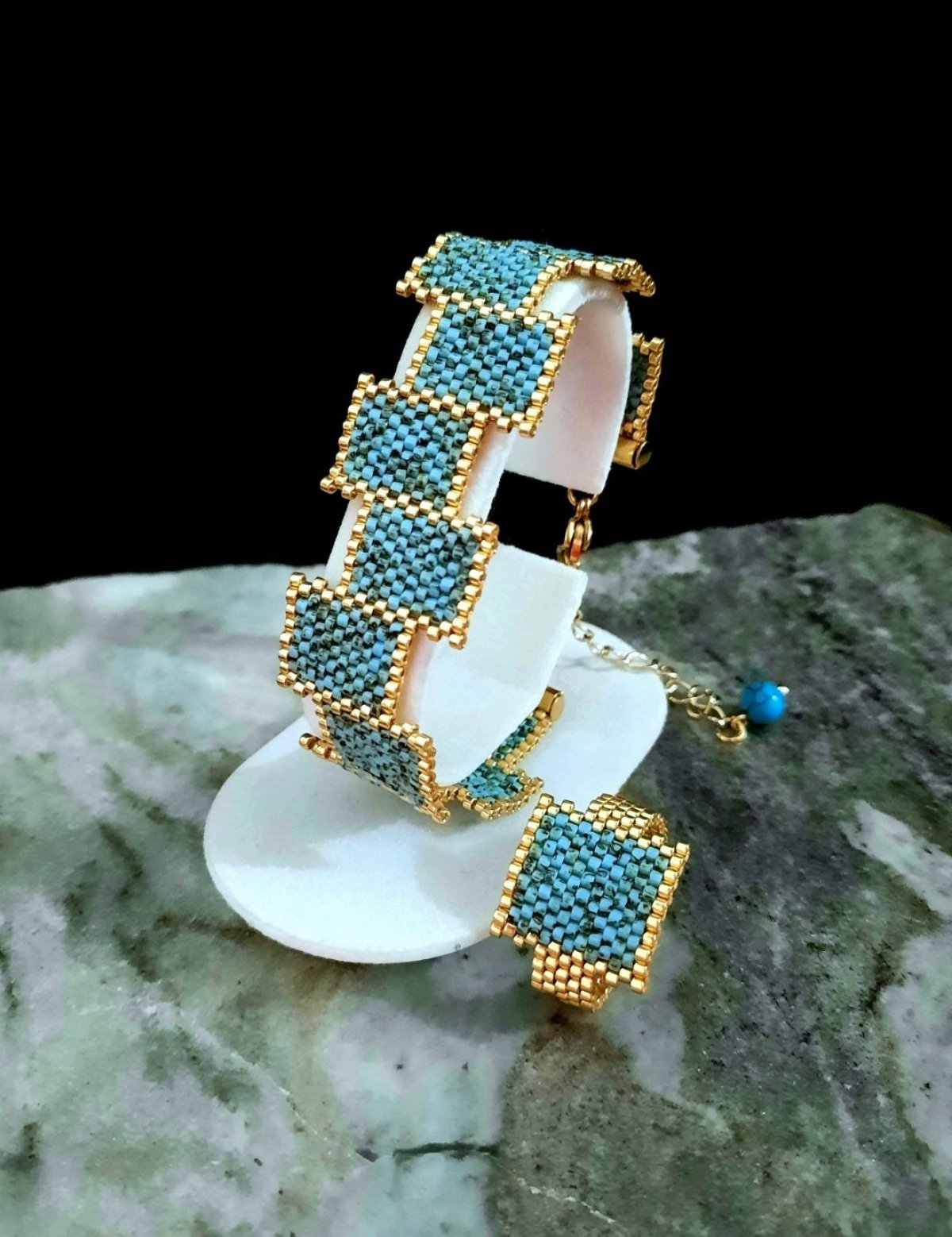 Turquoise rectangular bracelet set made of Miyuki beads