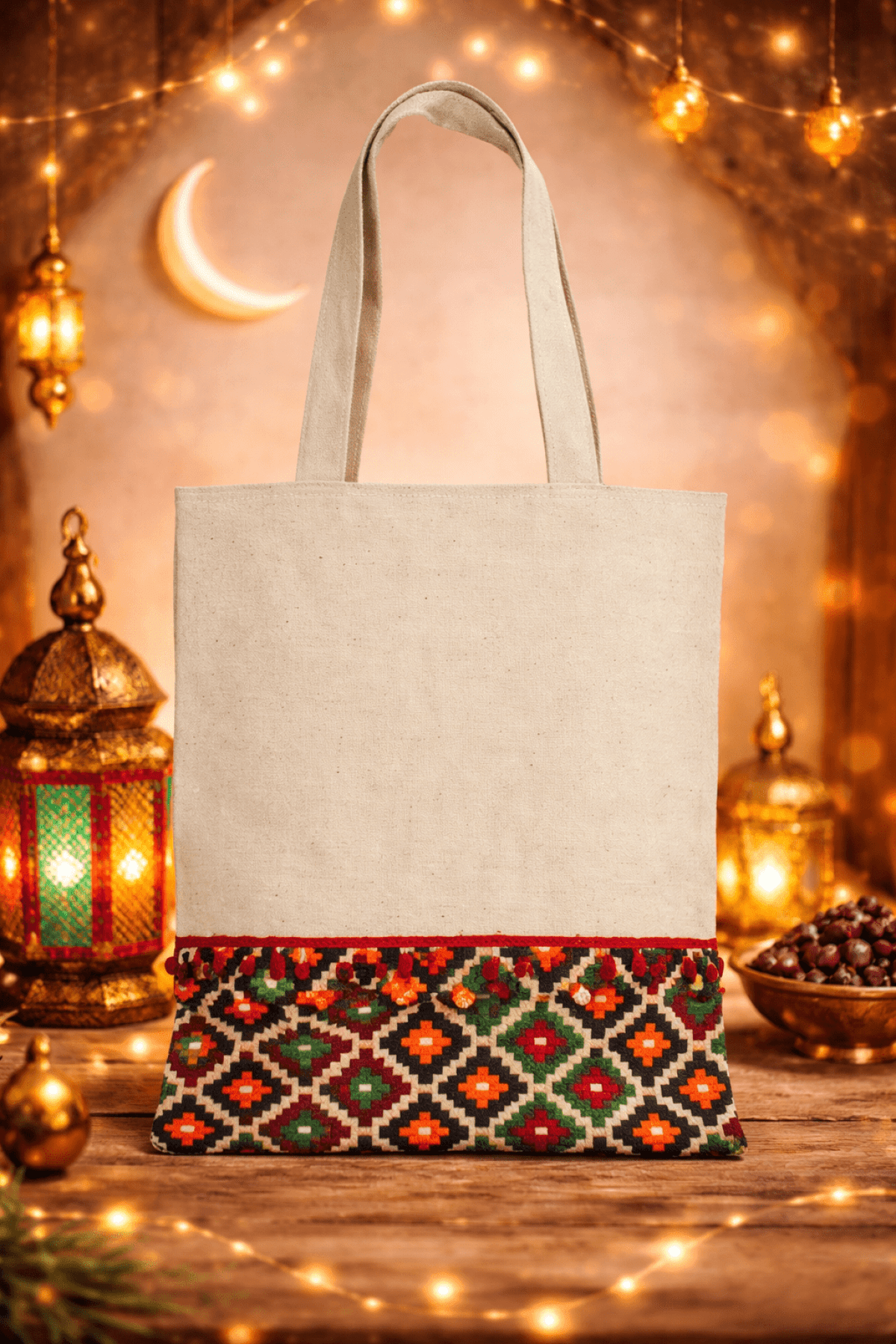 A premium handcrafted tote bag made from premium dak fabric, finished with distinctive embroidered details inspired by art and Ramadan culture. Elegant, durable, and effortlessly versatile, designed for everyday use, Ramadan moments, and refined gifting. Size: 40 cm width * 45 cm height Hand length 60 cm