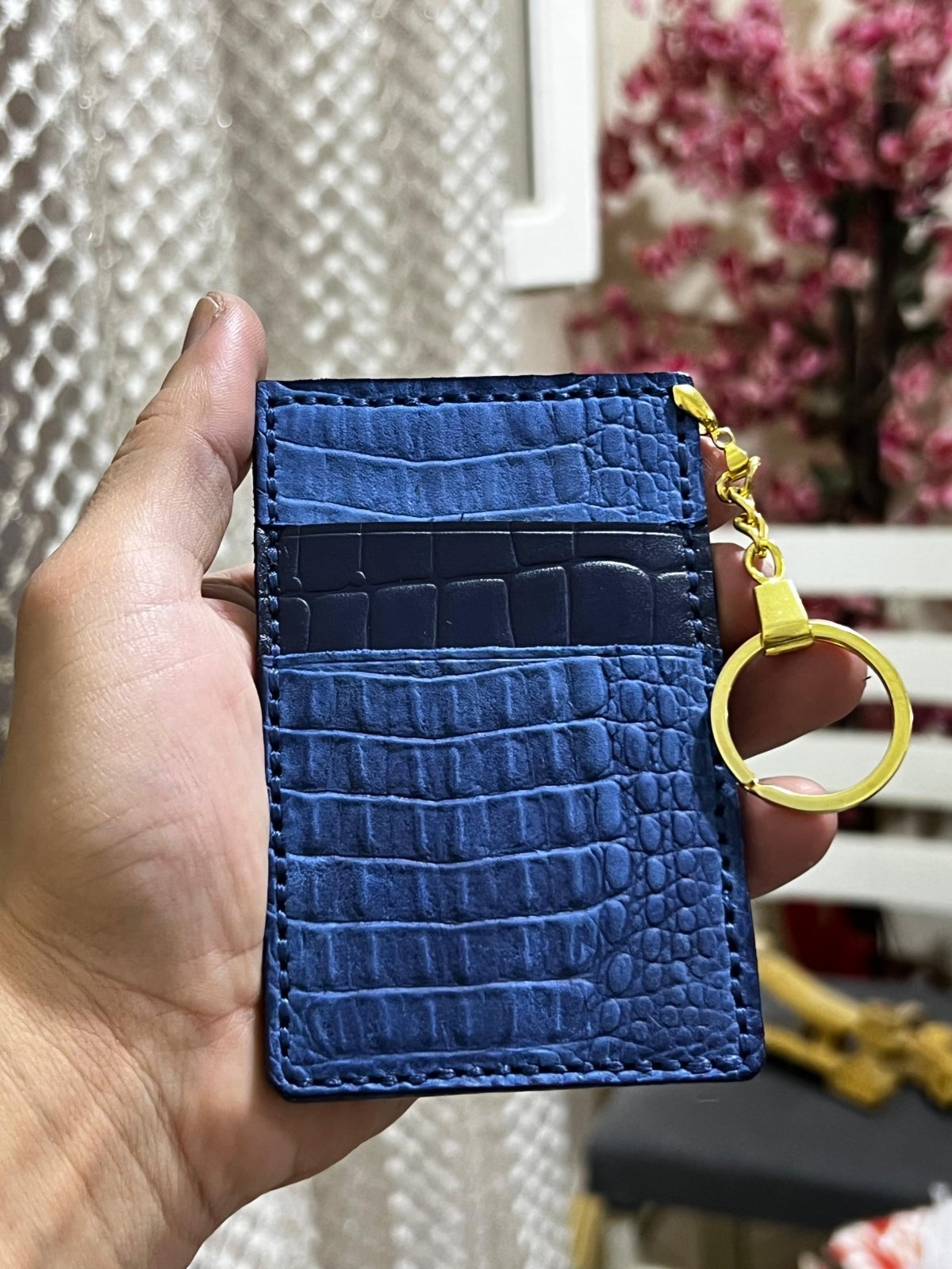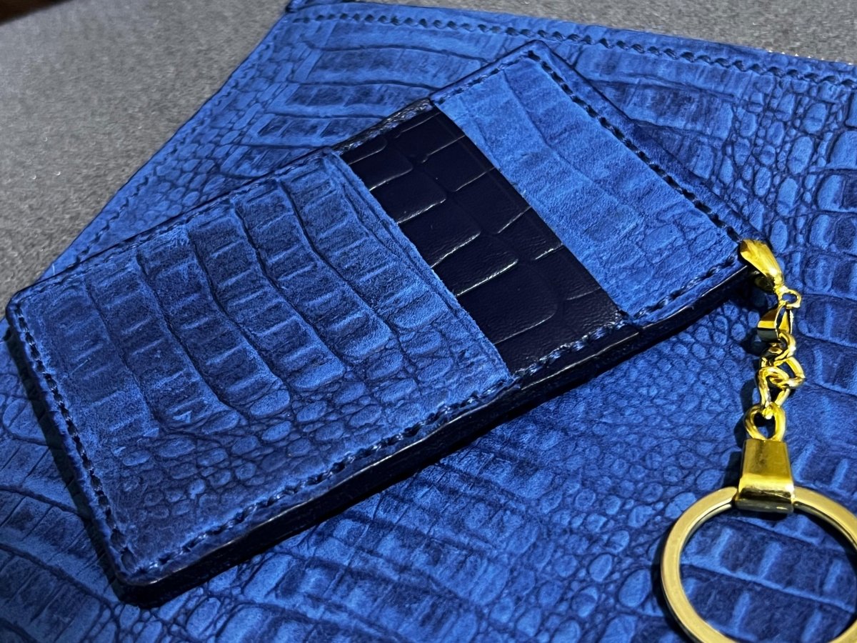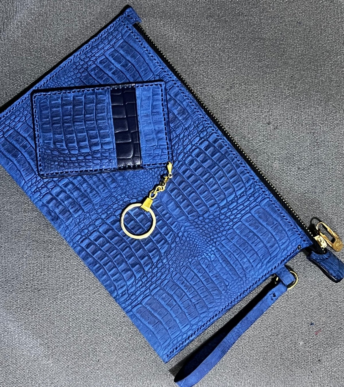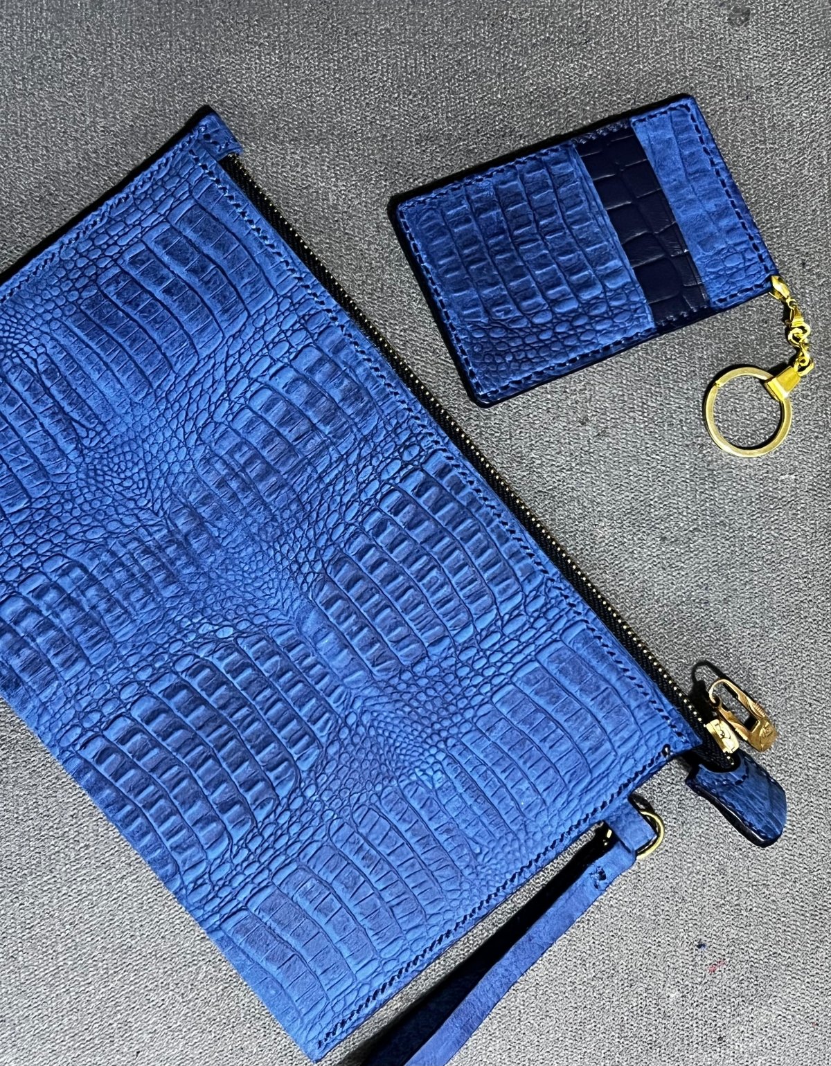 Genuine leather crocodile print clutch with matching card holder. Metal zipper.