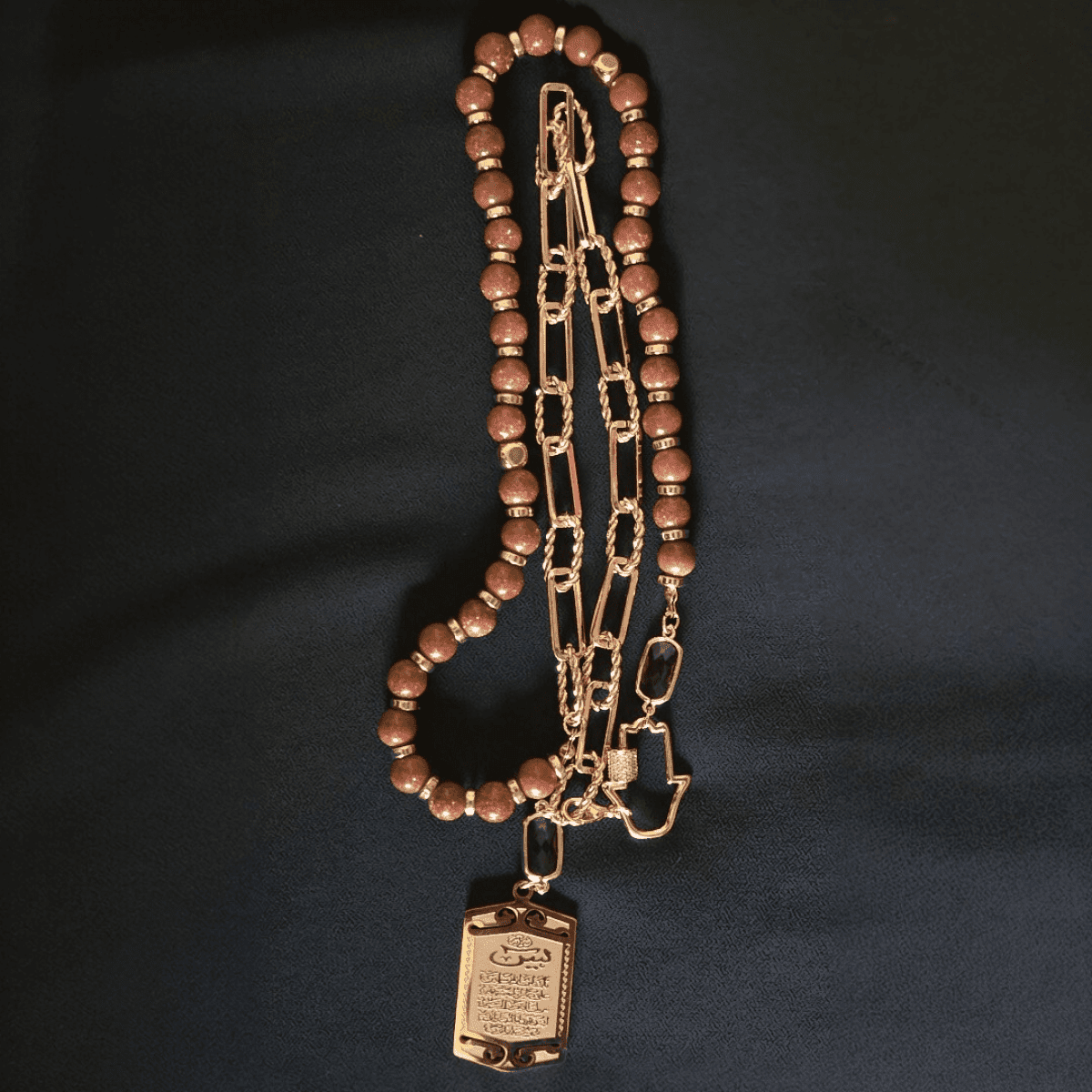 A 33-bead Goldstone Tasbih crafted on a Chinese gold chain, featuring golden Hematite spacers and a gold-plated stainless steel pendant, with a Chinese gold clasp that allows it to be worn as a necklace or wrapped as a bracelet.