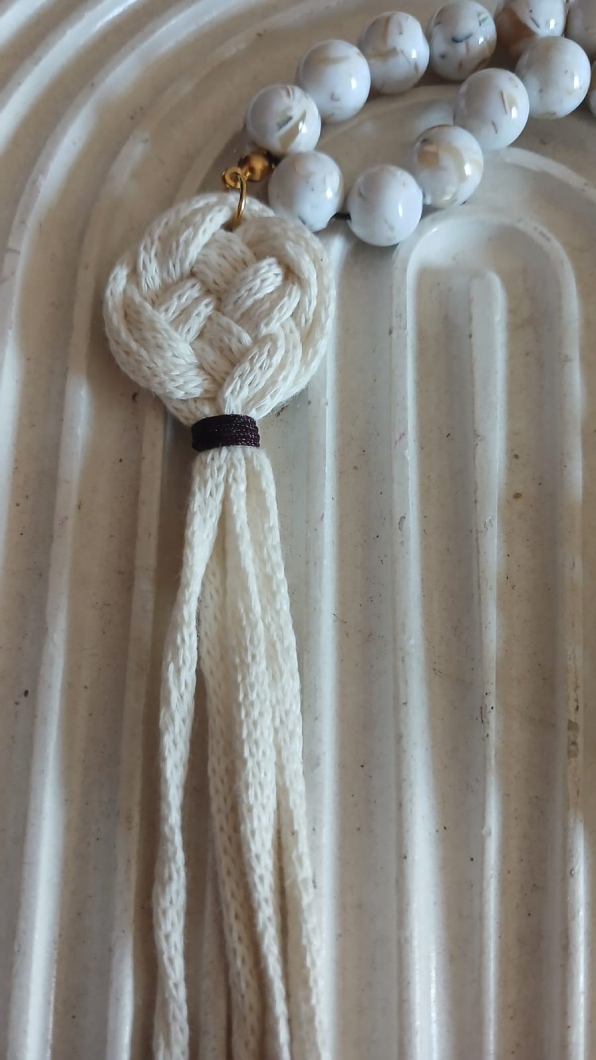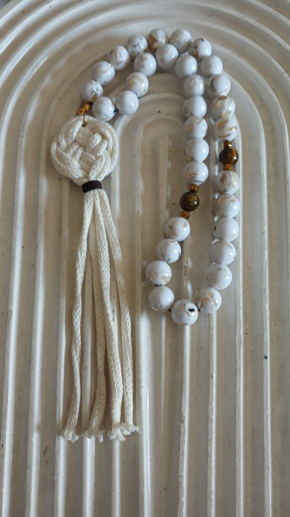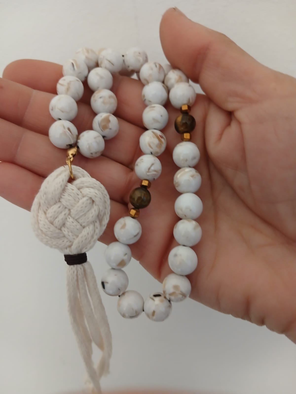 Turquoise Shell & Macramé Rosary A stunning 33-bead rosary handcrafted with Turquoise Sea Shell stones, complemented by Tiger Eye and Hematite spacers. Featuring a unique, handmade Macramé tassel for a perfect blend of spiritual elegance and artisanal craft.