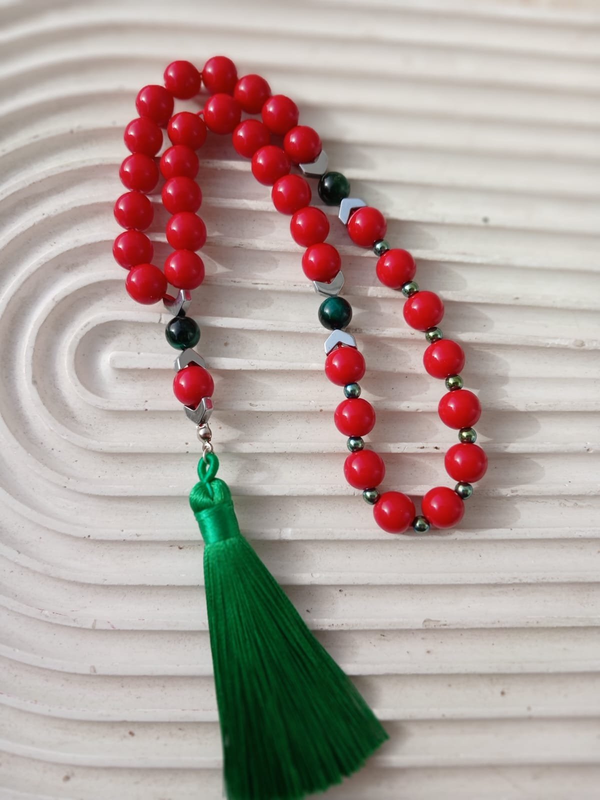 Crimson Serenity Rosary A bold and elegant 33-bead rosary featuring vibrant Red Agate stones, accented with metallic Hematite spacers and Tiger Eye stones. Finished with a premium green silk tassel, this handmade piece combines traditional beauty with a striking color contrast.