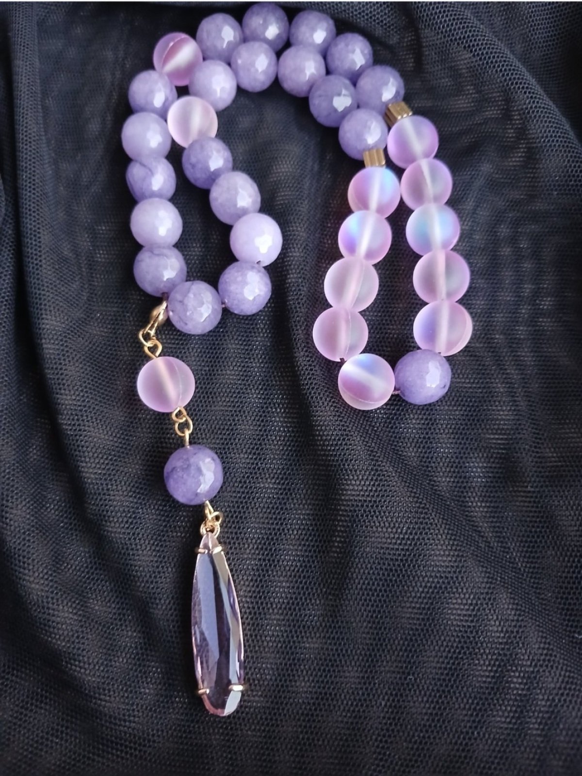 Opal & Agate Serenity Rosary A breathtaking blend of Purple Agate and mystical Opal stones. This 33-bead handmade rosary features a luxurious crystal teardrop pendant, designed for those who seek elegance and peace in every bead.