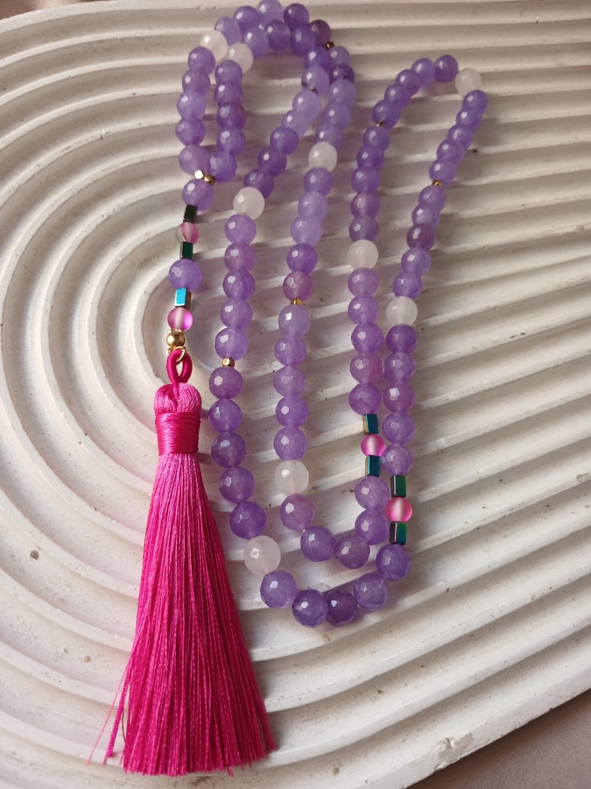 Agate Glow Serenity Rosary A premium 99-bead rosary crafted from rich Purple Agate stones. This handmade piece is uniquely accented with three luminous Opal spacers and metallic Hematite, finished with a vibrant pink silk tassel. A perfect blend of traditional strength and subtle elegance.
