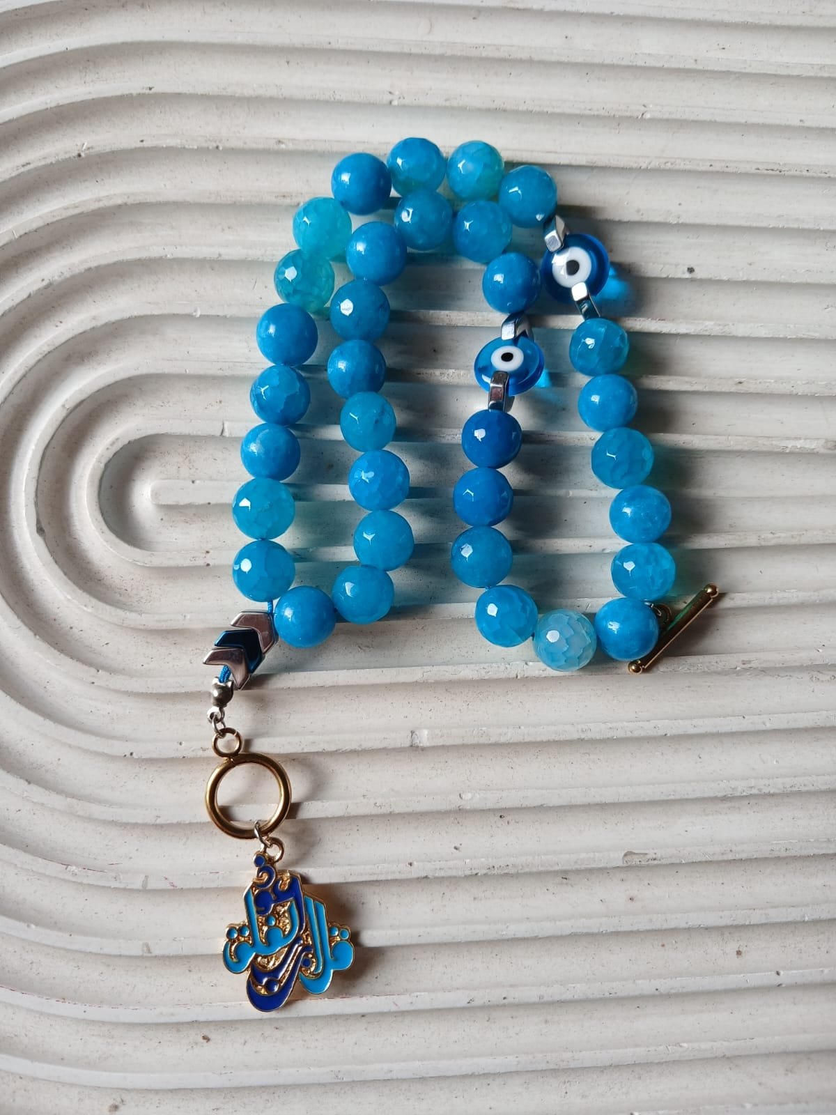A vibrant 33-bead rosary handcrafted from high-quality Blue Agate stones. This spiritual piece is uniquely accented with Evil Eye spacers and a stunning golden "Qul A'udhu Bi Rabbil-Falaq" calligraphy pendant. A perfect blend of faith, protection, and elegant craftsmanship.