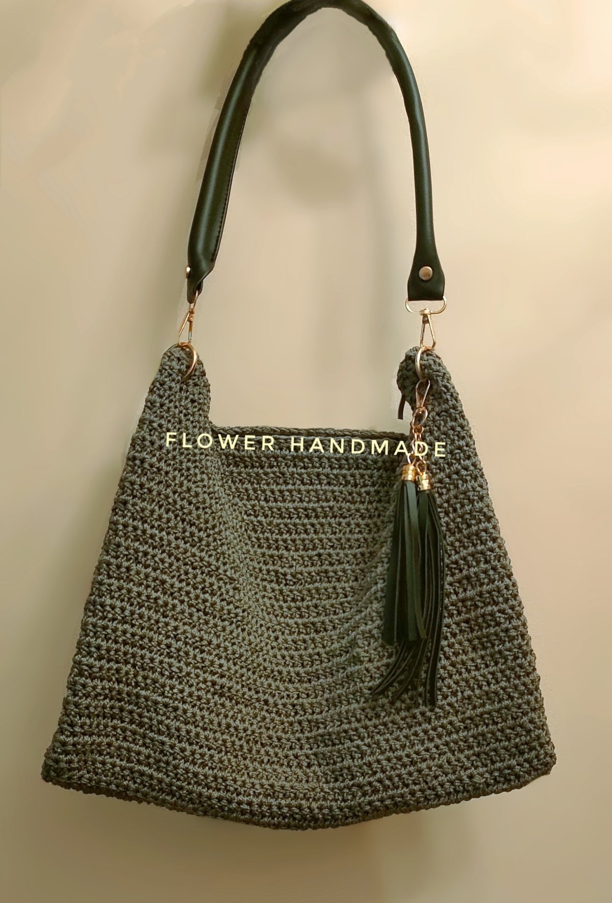 Crochet bag with cotton yarn. Stan lining . with shoulder strap and leather crossbody strap. Size: 40 x 35 cm