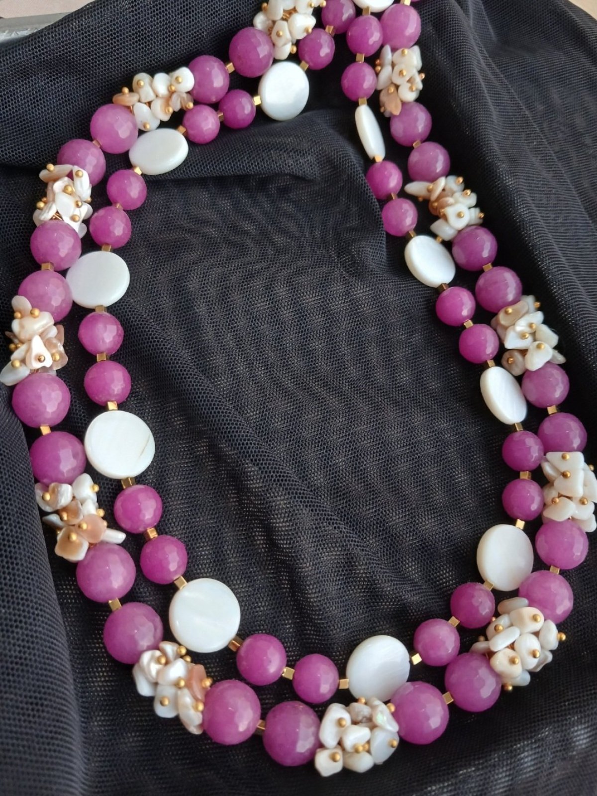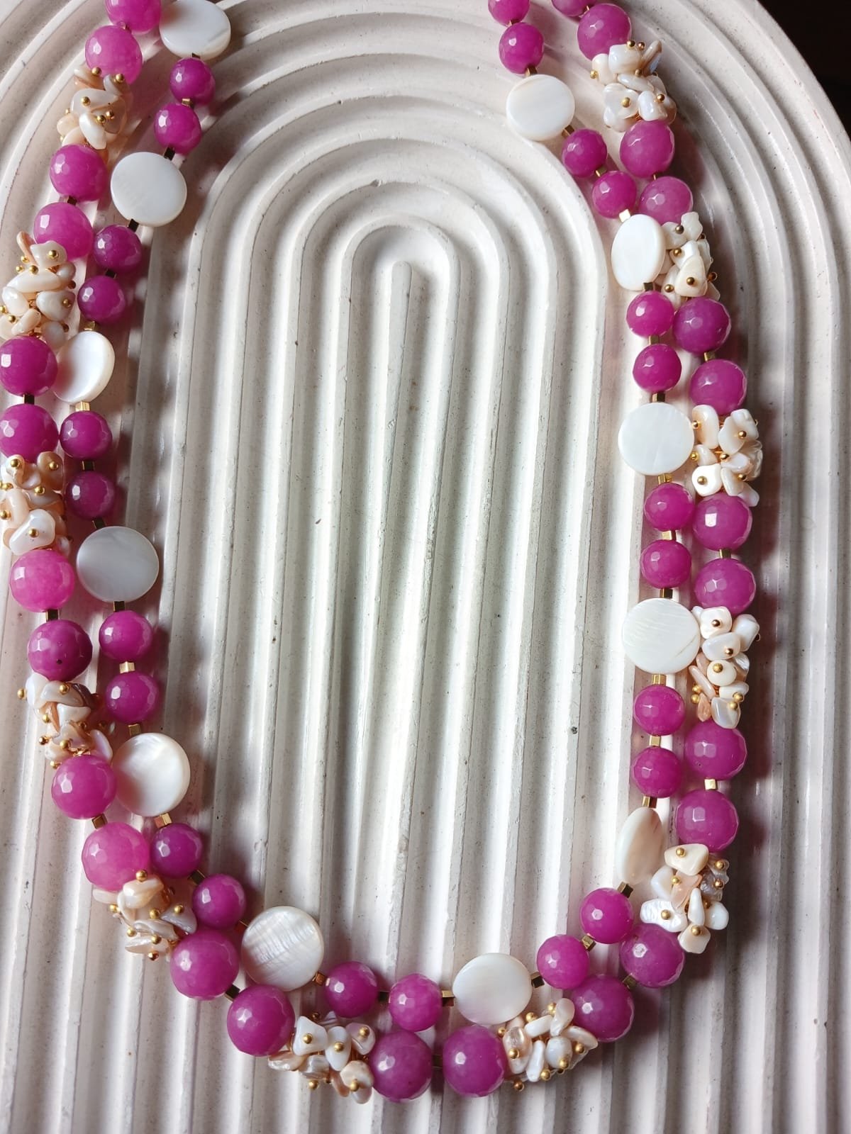 A breathtaking multi-layered masterpiece handcrafted with premium Vibrant Agate stones and genuine Mother of Pearl accents. This elegant piece features a harmonious blend of round shell discs and delicate shell clusters, highlighted by golden-tone spacers. A perfect statement of natural luxury and sophisticated artistry.