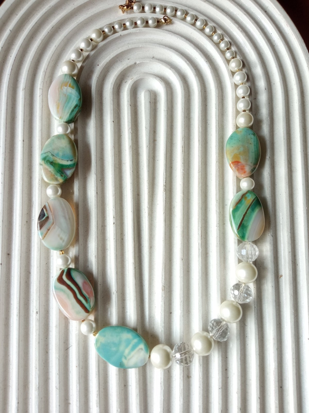 A bold and artistic statement piece handcrafted with premium Flat Agate stones featuring unique natural patterns. This necklace beautifully combines various sizes of Shell Pearls with shimmering Clear Crystals, accented with golden-tone hardware. Its sophisticated design and serene color palette make it the perfect accessory for a refined, effortless look.
