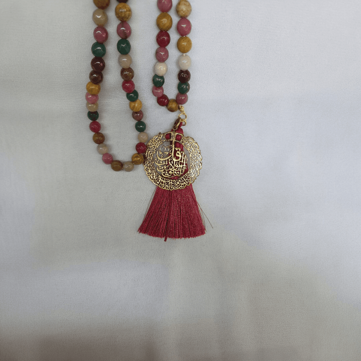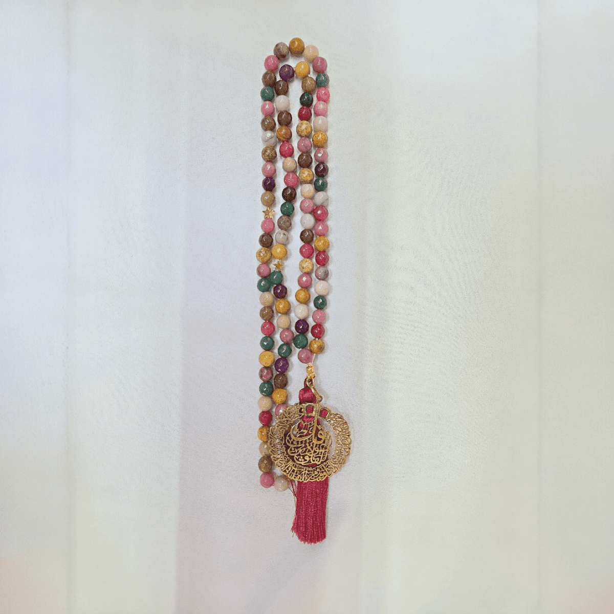 A 99-bead Tasbih (8mm) made of colorful Agate stones, featuring gold-plated Hematite spacers. It includes a golden-colored brass pendant and a soft silk tassel.