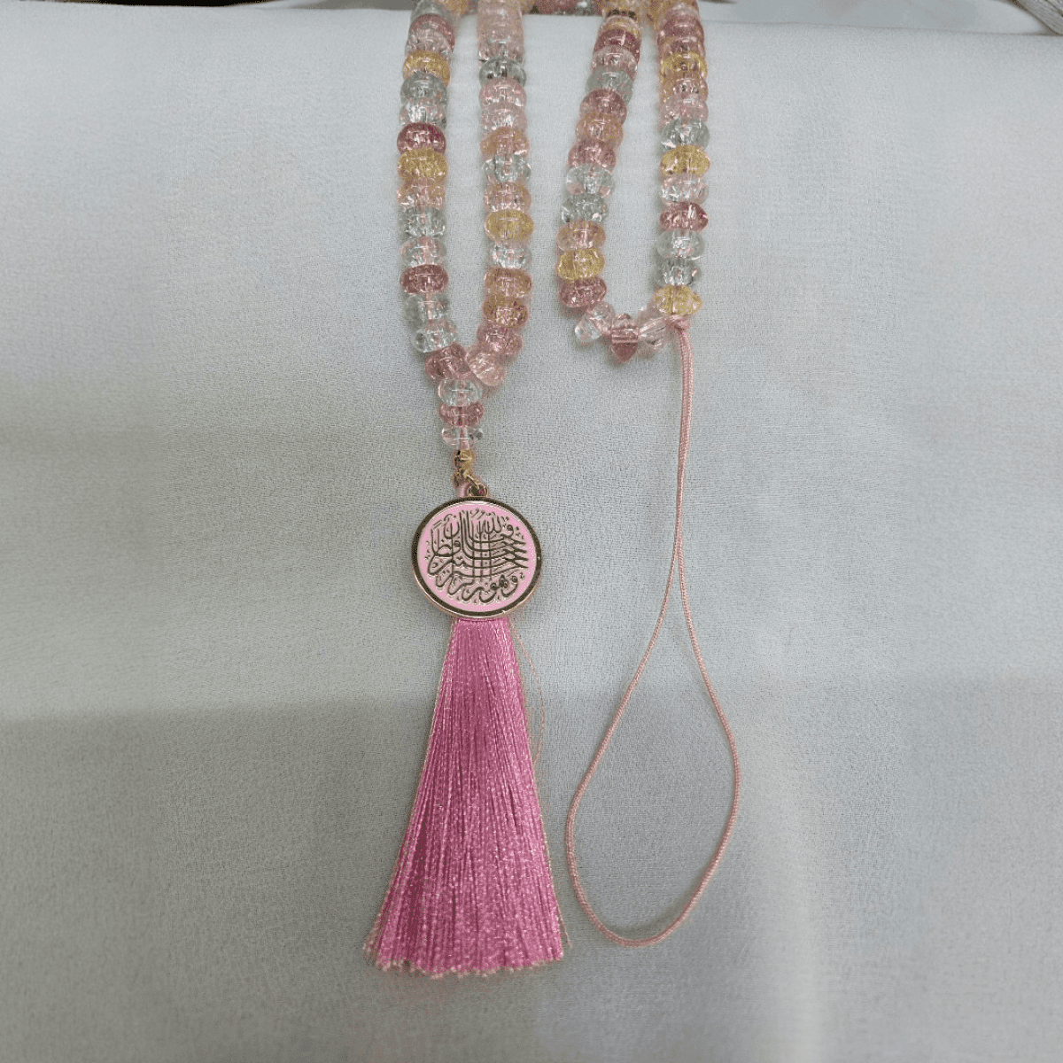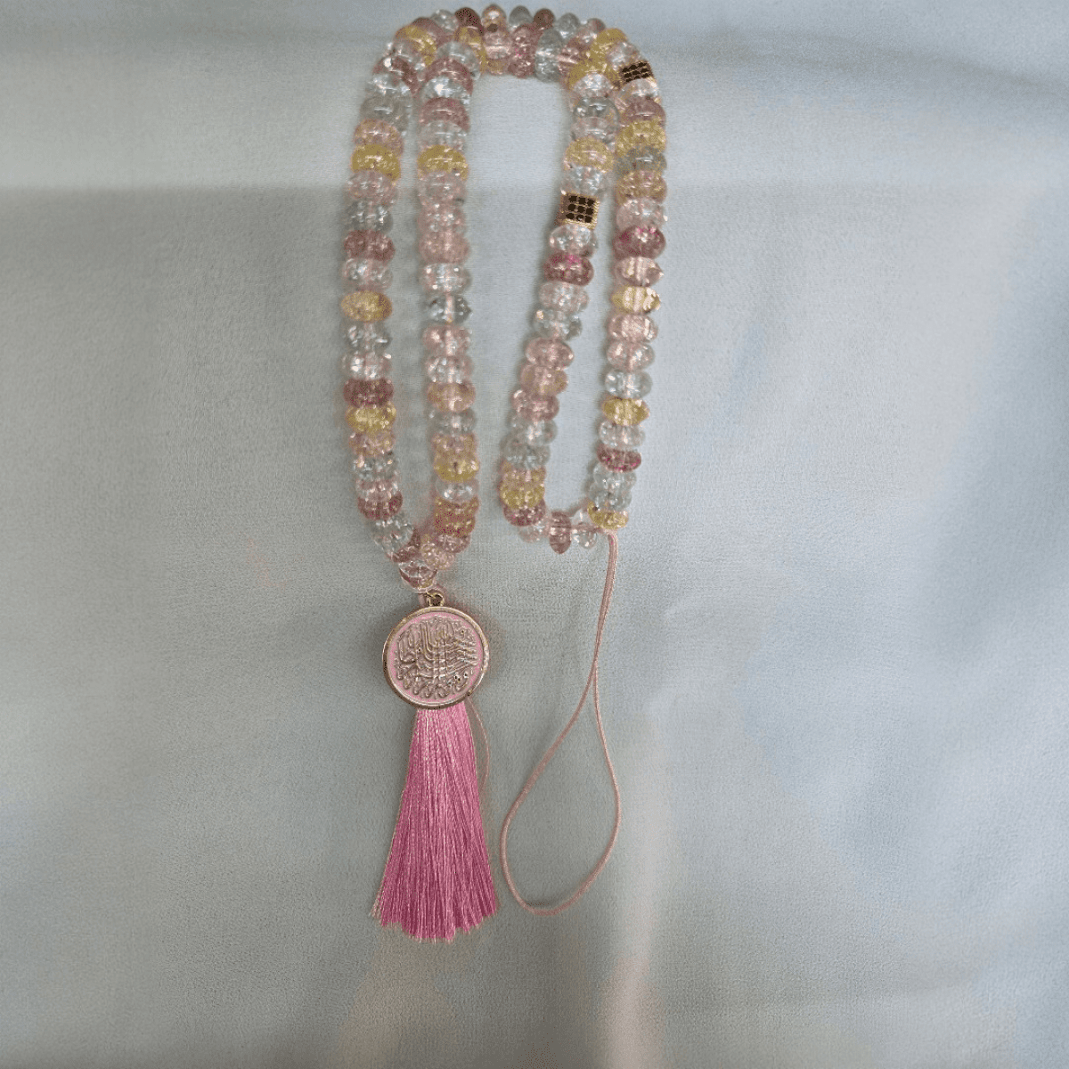 A 99-bead Tasbih made of colorful crystals, featuring Chinese gold spacers and a golden stainless steel pendant. It includes a silk tassel and is specifically designed to be used as a phone charm.