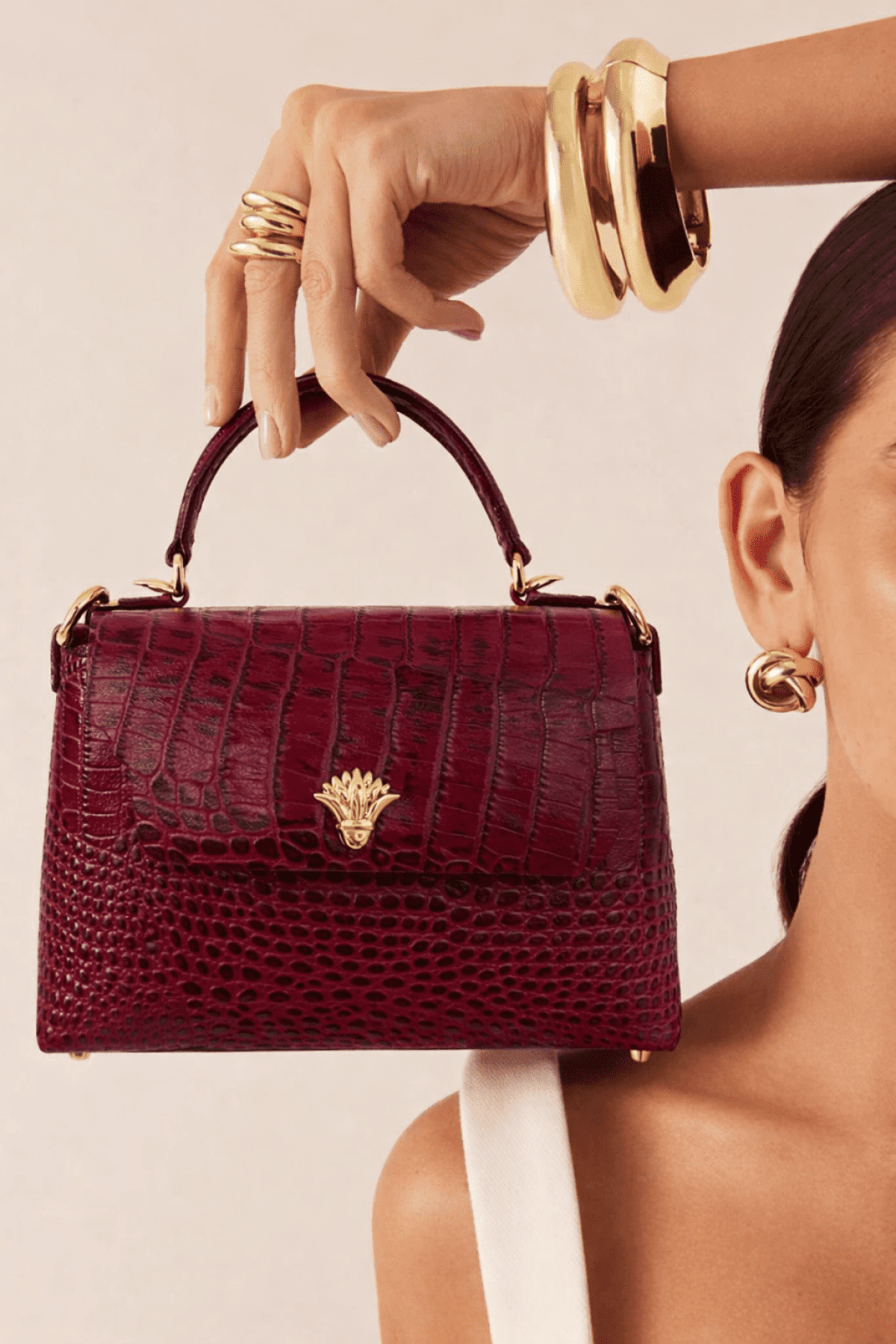 A sophisticated bag crafted from crocodile-embossed leather in a rich burgundy shade, finished with gold-tone hardware and a sleek top handle. Elegant, timeless, and perfect for day-to-night styling. Size 24*16*8