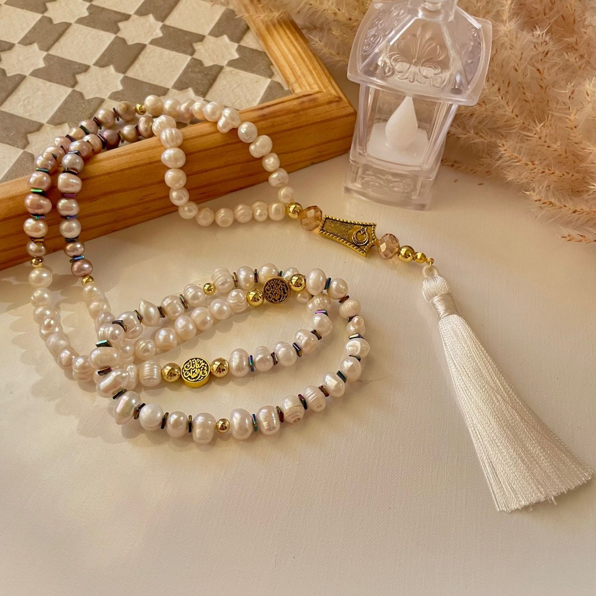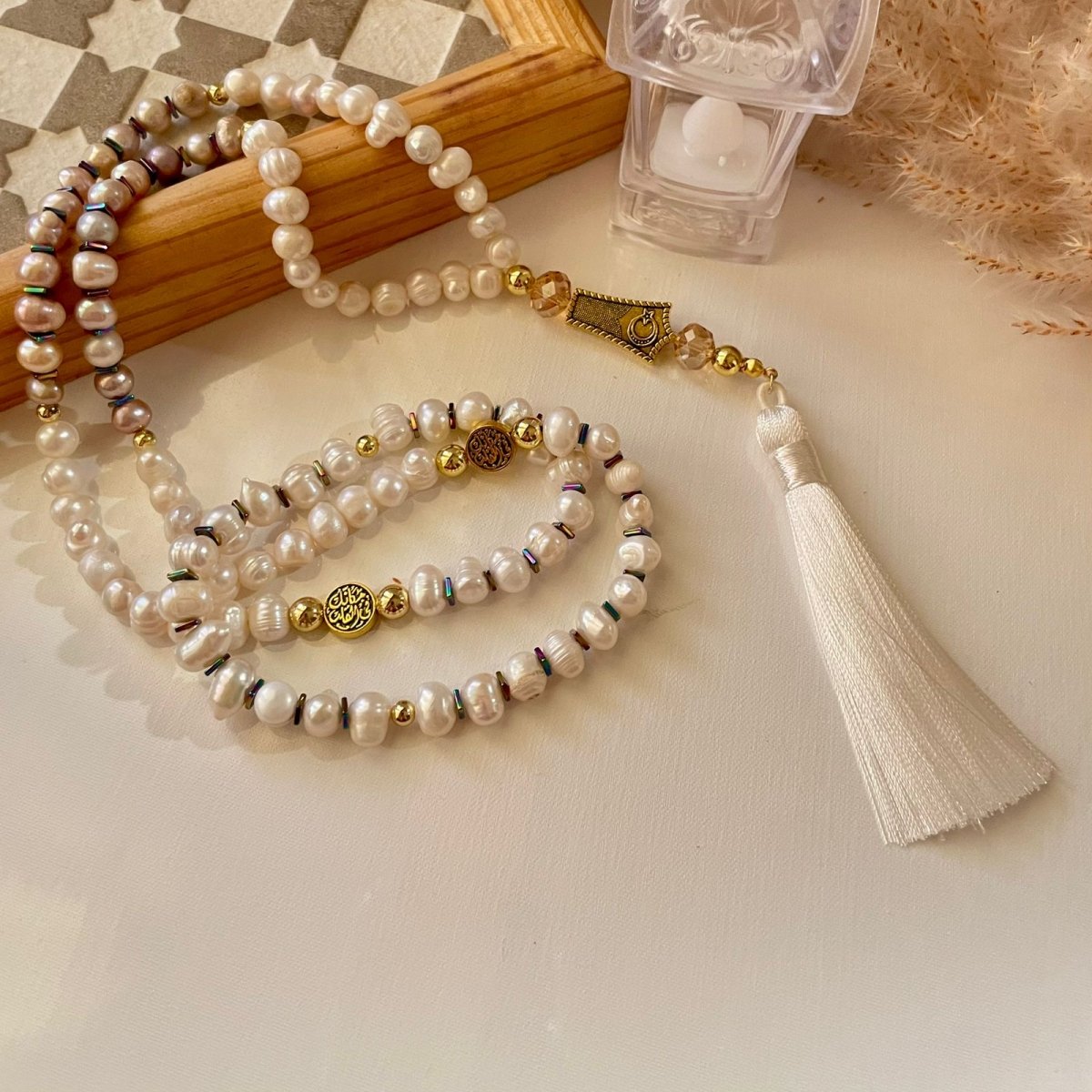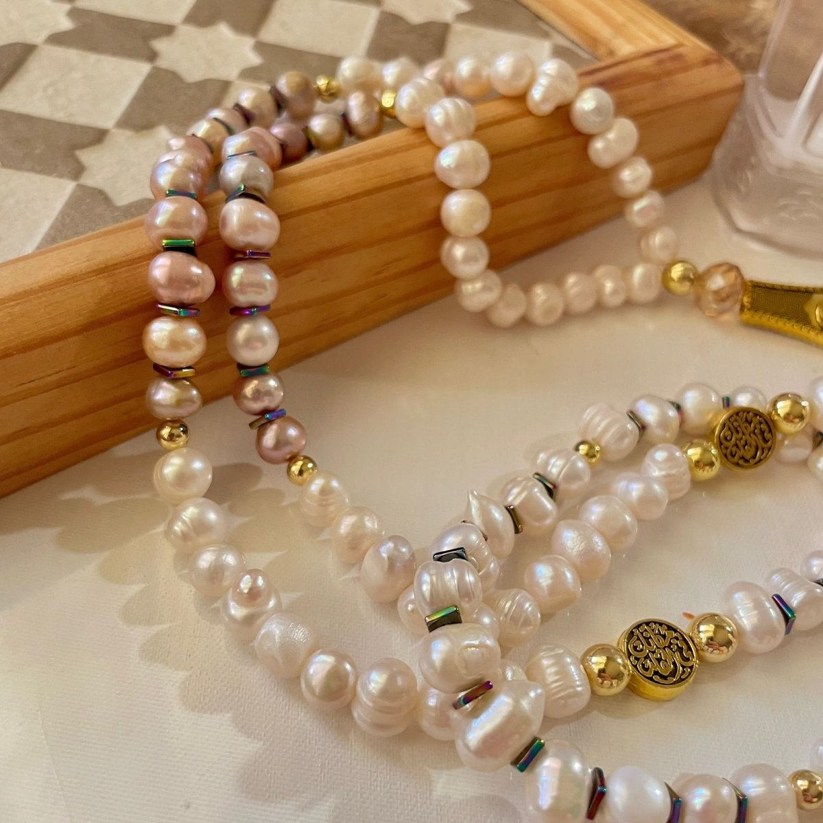Natural pearl rosary, 8 mm size, 100 beads, combining white and pink pearls with golden and multicolored hematite and a silk tassel