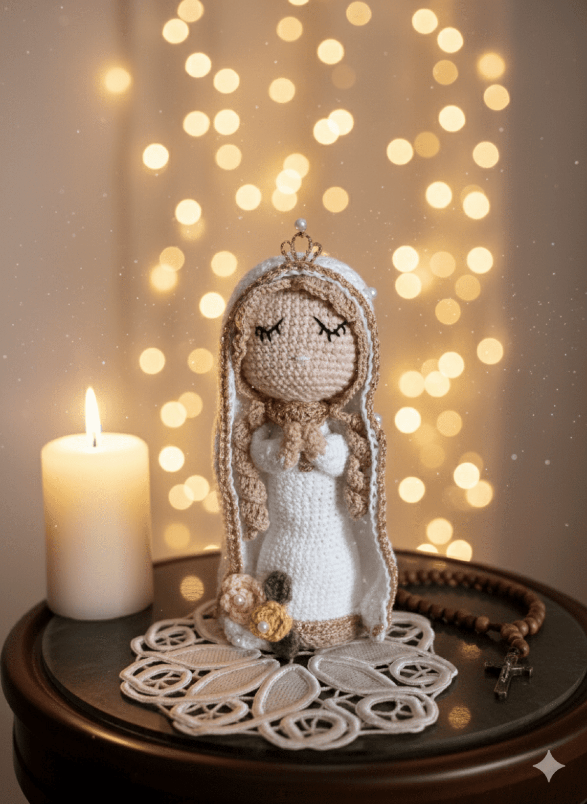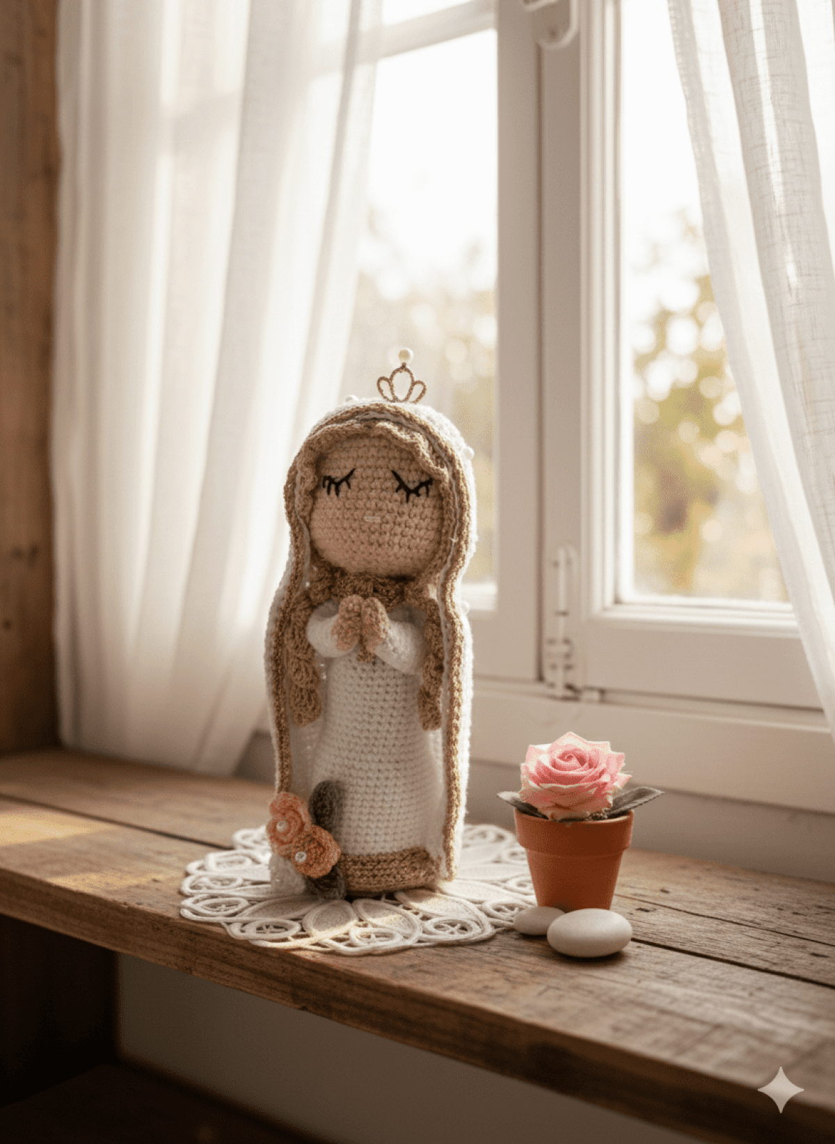 هذه الدميه المصنوعه يدويا بحرفيه عاليه للسيده العذراء فى شكل روحاني هادئ المواصفات الطول:٢٠سم الرأس والشعر:الرأس محاك بخيط لون البشره الطبيعى،مع الشعر باللون البيج الفاتح ينسدل بشكل مموج تخت غطاء الرأس. الملامح:العينان مطرزتان بخيط أسود مغلقتان تعكس وضع . الصلاه والخشوع الرداء:فستان أبيض ناصع مع غطاء الرأس كلاهما مزين بإطار ذهبى لامع مع الحواف الاكسسوار:تاج ذهبى رقيق يعلو الرأس مزين بخرزه لؤلؤيه كوليه ذهبى حول العنق حبات لؤلؤ تزين غطاء الرأس قاعده الرداء مزينه بثلاث وردات مع أوراق الشجر Abeautifully handcrafted AMIGURUMI doll representing the virgin mary in aserene playful stance. Technical details: Height:approximately 20cm Outfit:she wears a pure white robe and matching awhite veil ,both finished with an elegant golden trim along the borders. Head &hair:beig wavey hair peeks gracefully from beneath the veil. Facial features:her eyes delicately embrodiered in a closed,peaceful position,symbolising deep mediation and prayer. Adornments:golden crown topped with a pearl. Awide golden choker necklace.the bottom of the robe decorated three crochet roses.