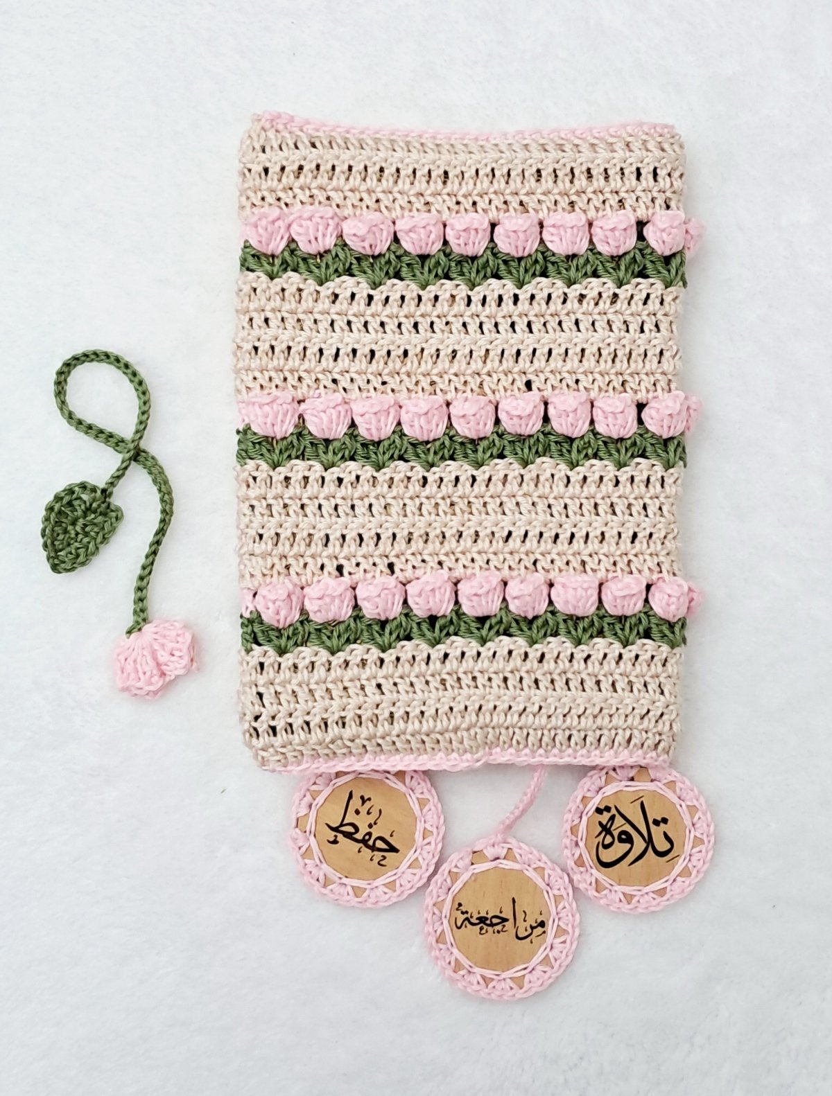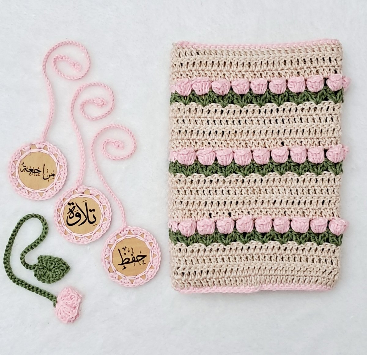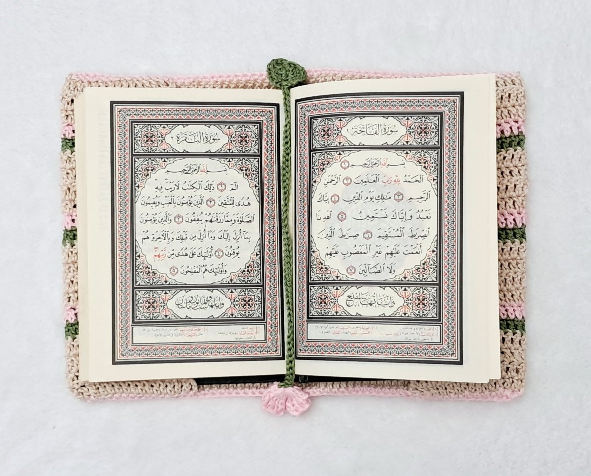 The Quran cover is made with high-quality cotton threads. The cover measures 14 x 20 cm. It comes with 4 bookmarks (recitation, memorization, Tajweed, and a rose bookmark). Any color and size can be made upon request.