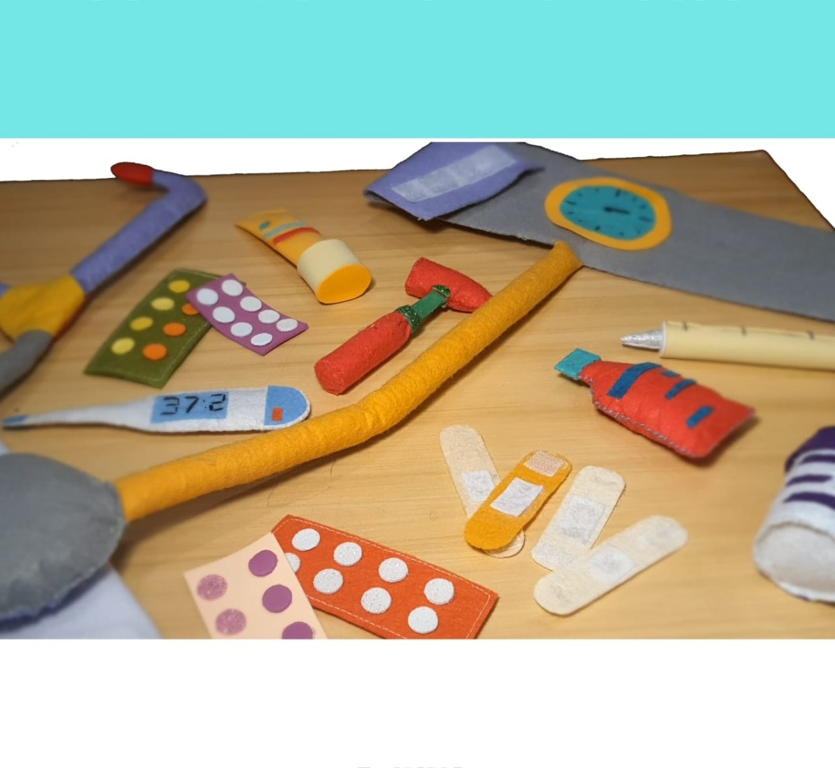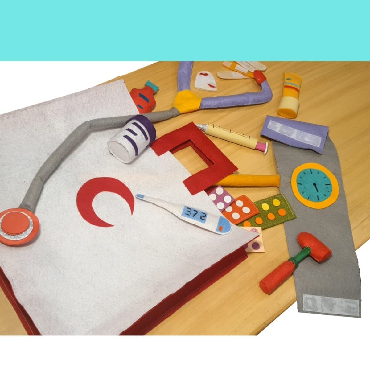 This set includes items like a toy stethoscope, thermometer, syringe, bandages, hammer and pretend medicine bottles, in addition to a felt fabric bag.