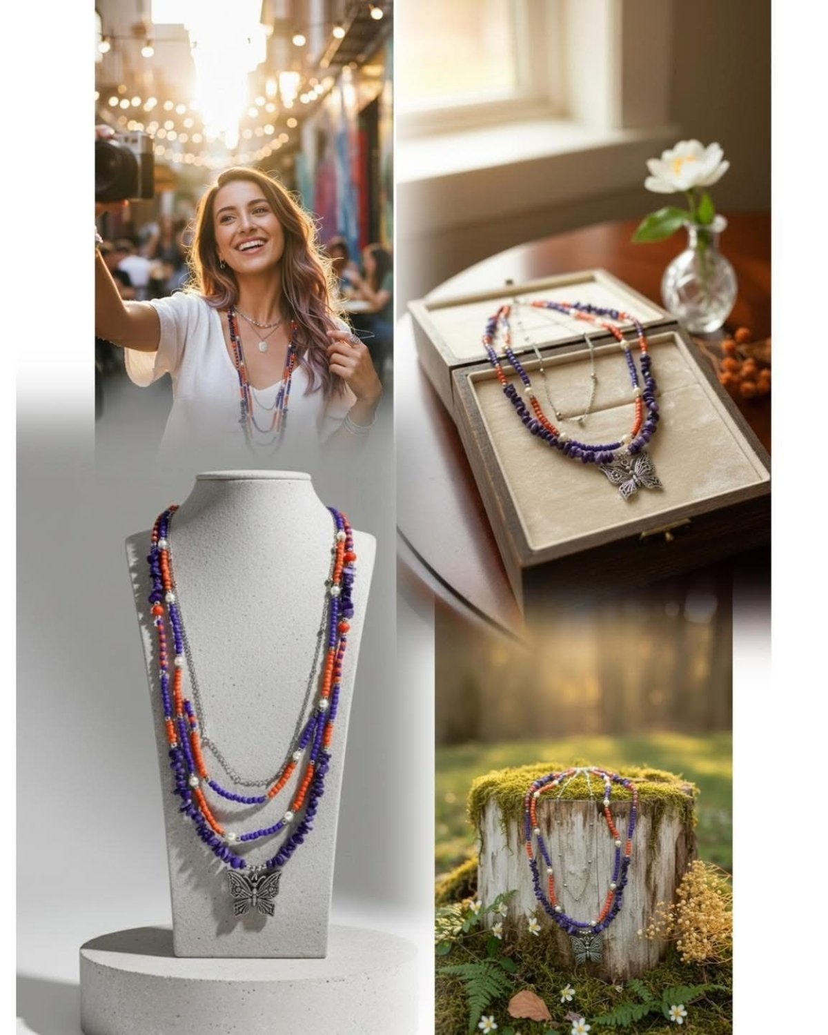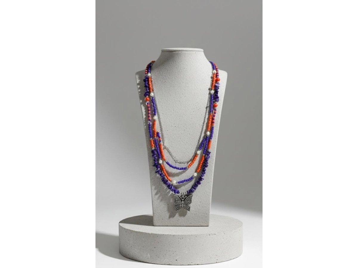 Butterfly of colors 🦋✨ Because the small details make the difference We made for you a multi-layered necklace that combines elegance and simplicity, from a silver chain, three layers of colored beads in lavender and orange, and a layer of two-colored beads inlaid with lavender-colored pewter, with a silver butterfly pendant especially for you 💜 so that you can complete your elegance with us 💜