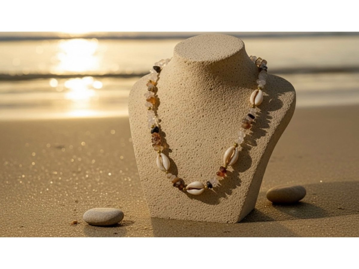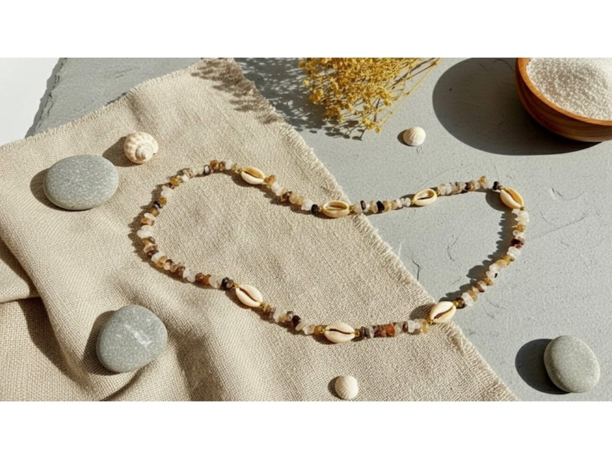 🌊🌊Beach spirit necklace🌊🌊 🐚🐚 Live the spirit of the sea in elegance with this charming necklace made of natural cowrie shells mixed with a group of colorful broken stones that reflect the sunlight wonderfully with wonderful shades of brown. The design is inspired by the tranquility of the beach and the warm touch of summer to add a fun and feminine touch to your beauty in every look. Perfect for everyday looks, summer dresses, and beach looks