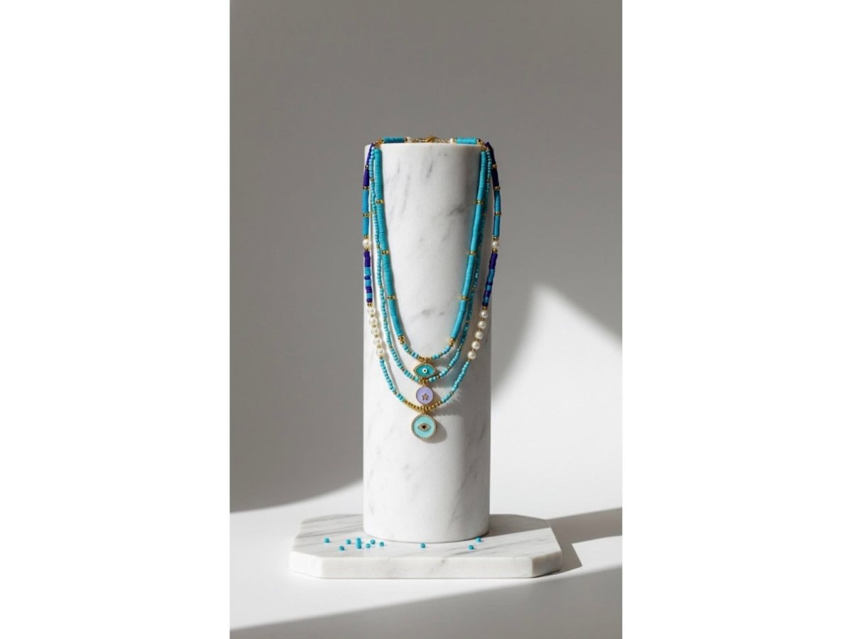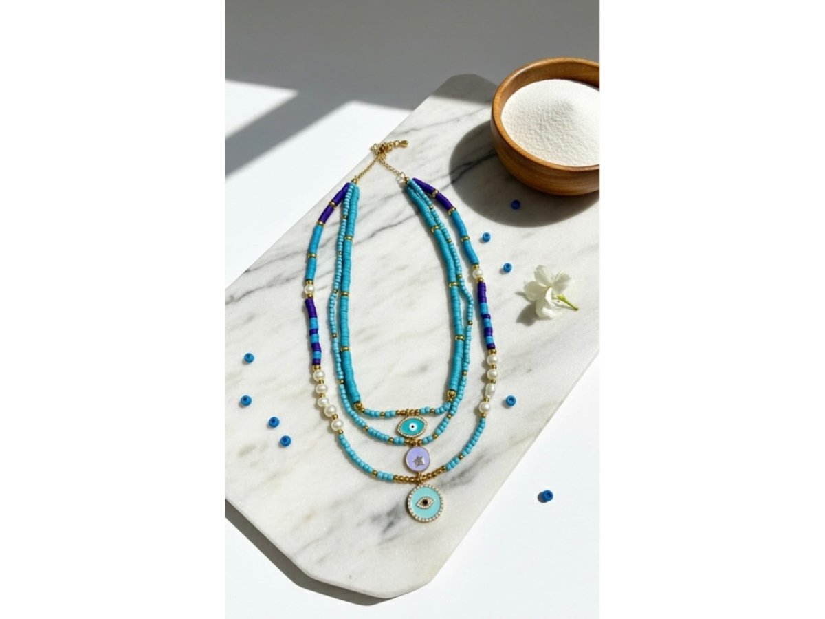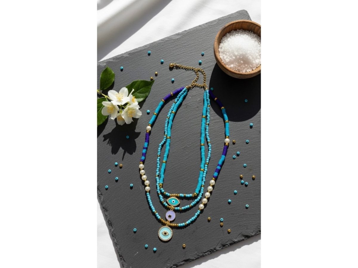 👁️Eye of Peace necklace👁️ Charming accessories that combine the energy of the color blue and the symbolism of the evil eye in a modern design consisting of three layers. The necklace is made of turquoise and purple beads with soft golden touches and small pearls that add elegance and elegance. Equipped with three distinctive suspensions that give you a touch of protection and elegance in every look. Suitable for summer, the beach, and daily outings, and it complements any look with simplicity and sophisticated taste. ✨💙