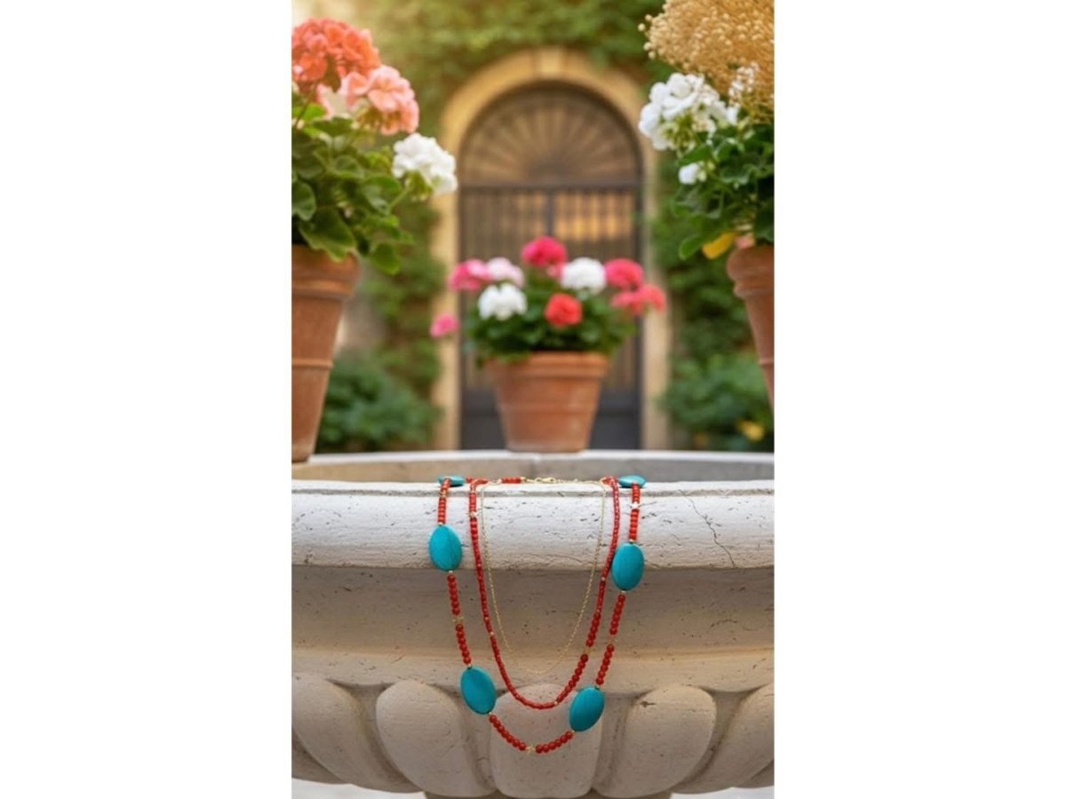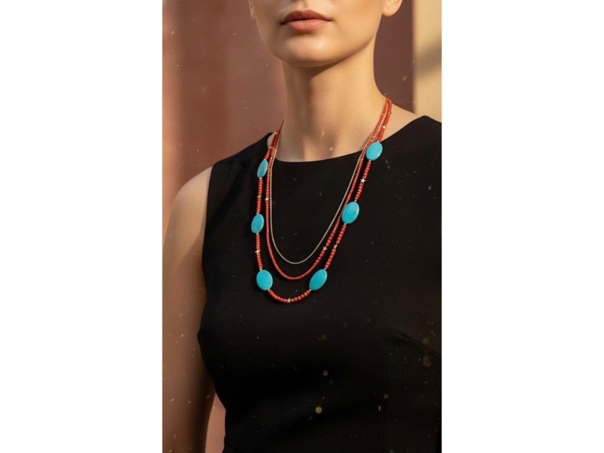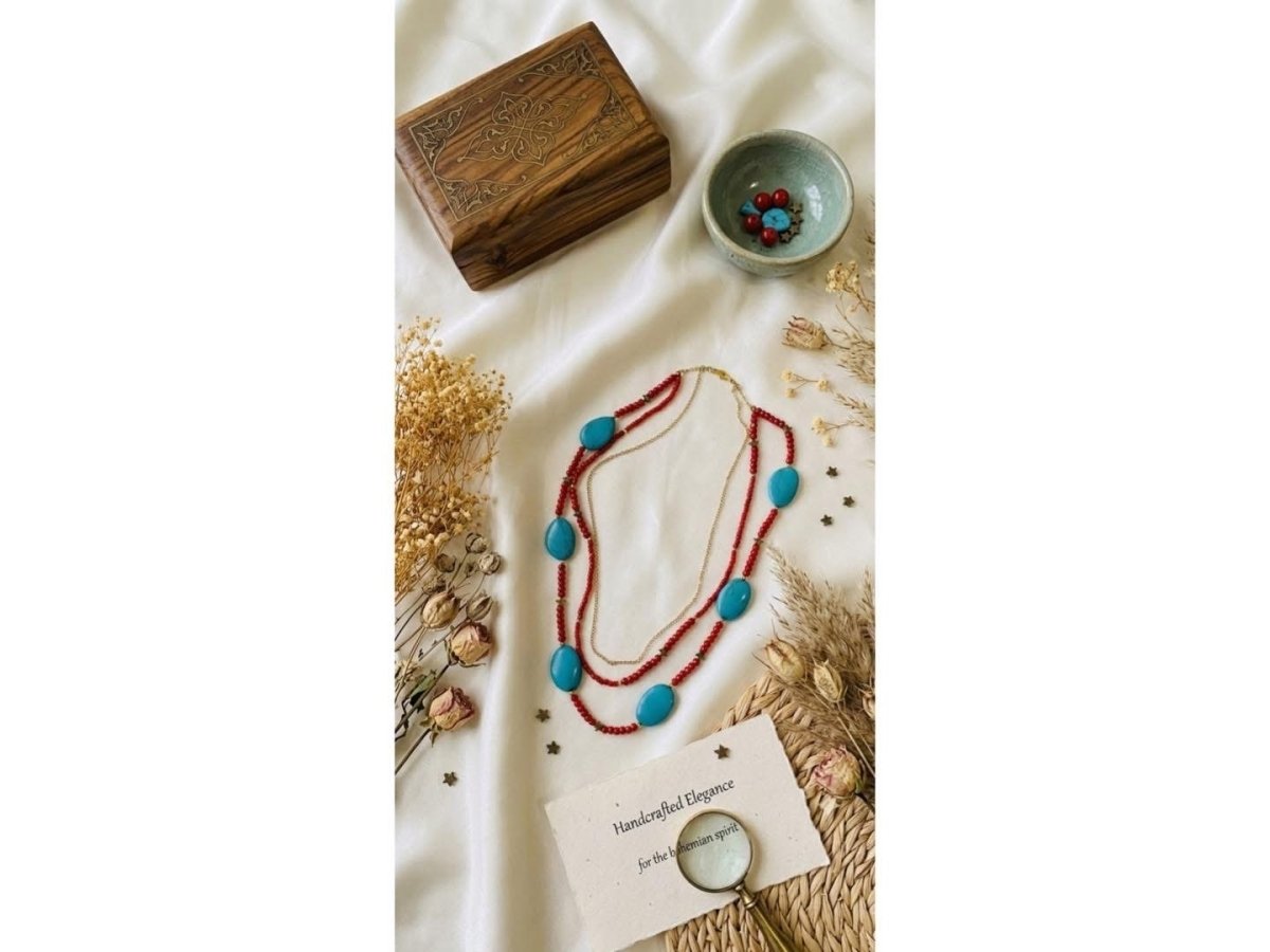 Elegance turquoise necklace A layered necklace that combines the elegance of turquoise stone and red crystal with a Chinese gold chain ❤️
