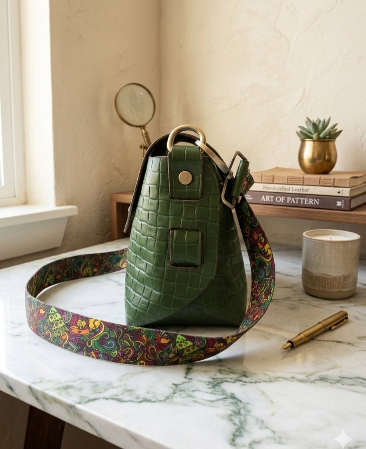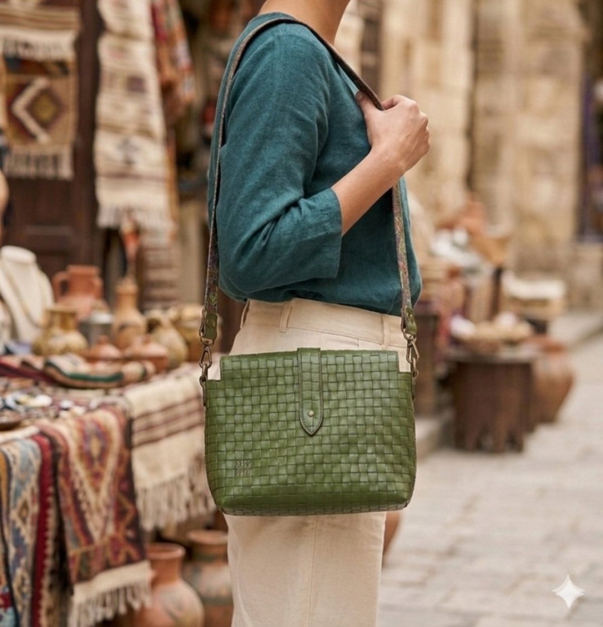A statement piece crafted from premium Egyptian natural bovine leather (the same quality exported to global luxury houses). Featuring a unique "braided-pattern" texture, this bag offers a rich, sophisticated look with a surprisingly soft and lightweight feel. It is meticulously designed to carry all your daily essentials without the extra bulk. To ensure long-lasting elegance and comfort, we used pure brass hardware and a high-quality imported fabric strap, specifically chosen to sit comfortably on your shoulder all day. Where handcrafted heritage meets everyday practicality.