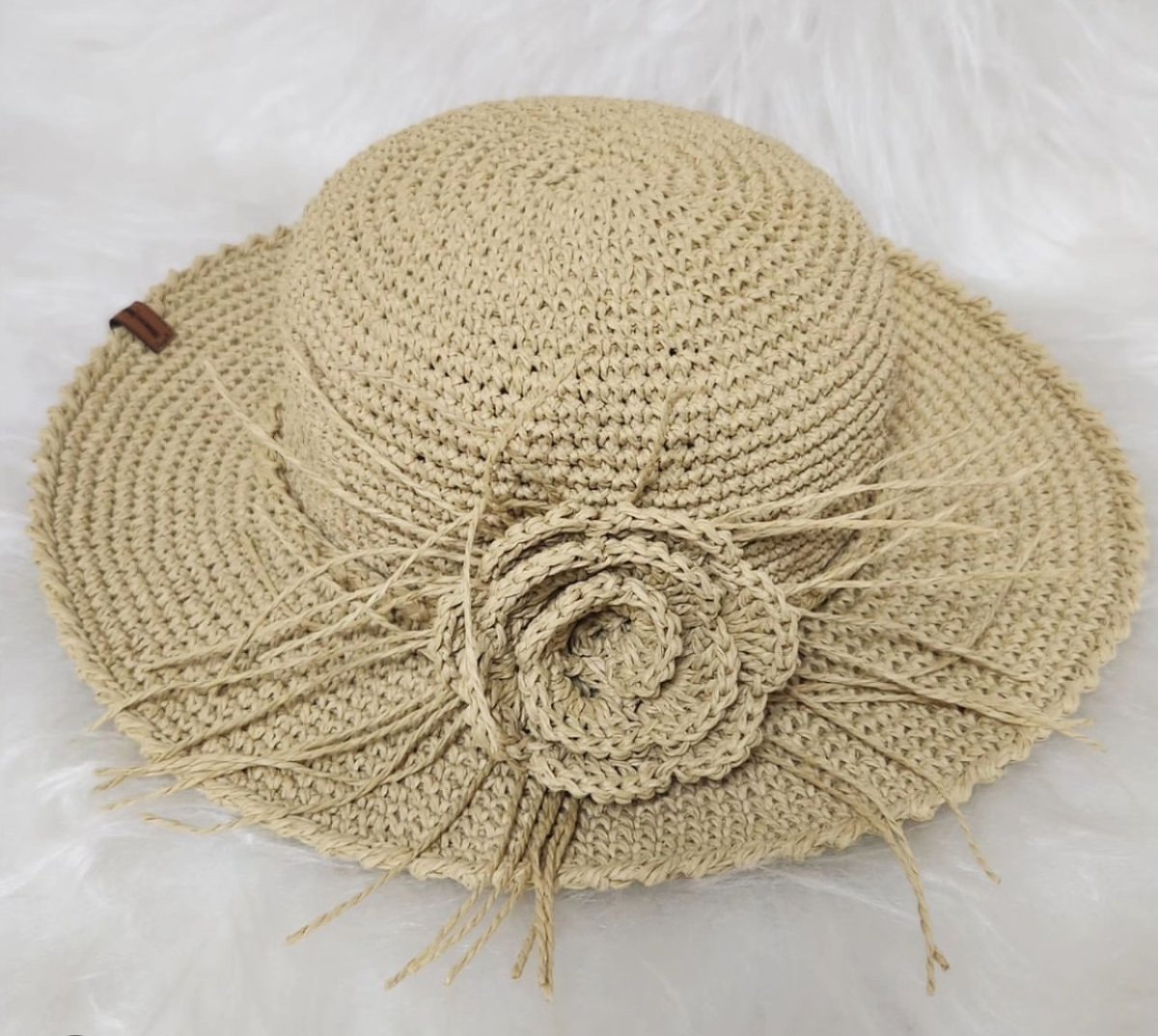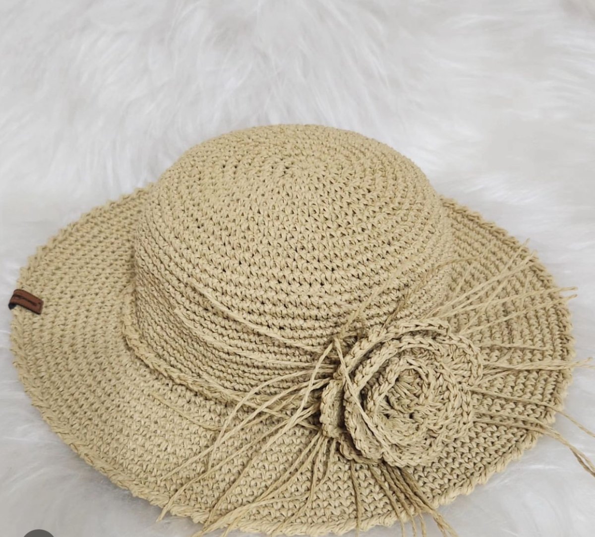Head hat with raffia yarn with a flower on it suits for summer and sea for good looking and fashion
