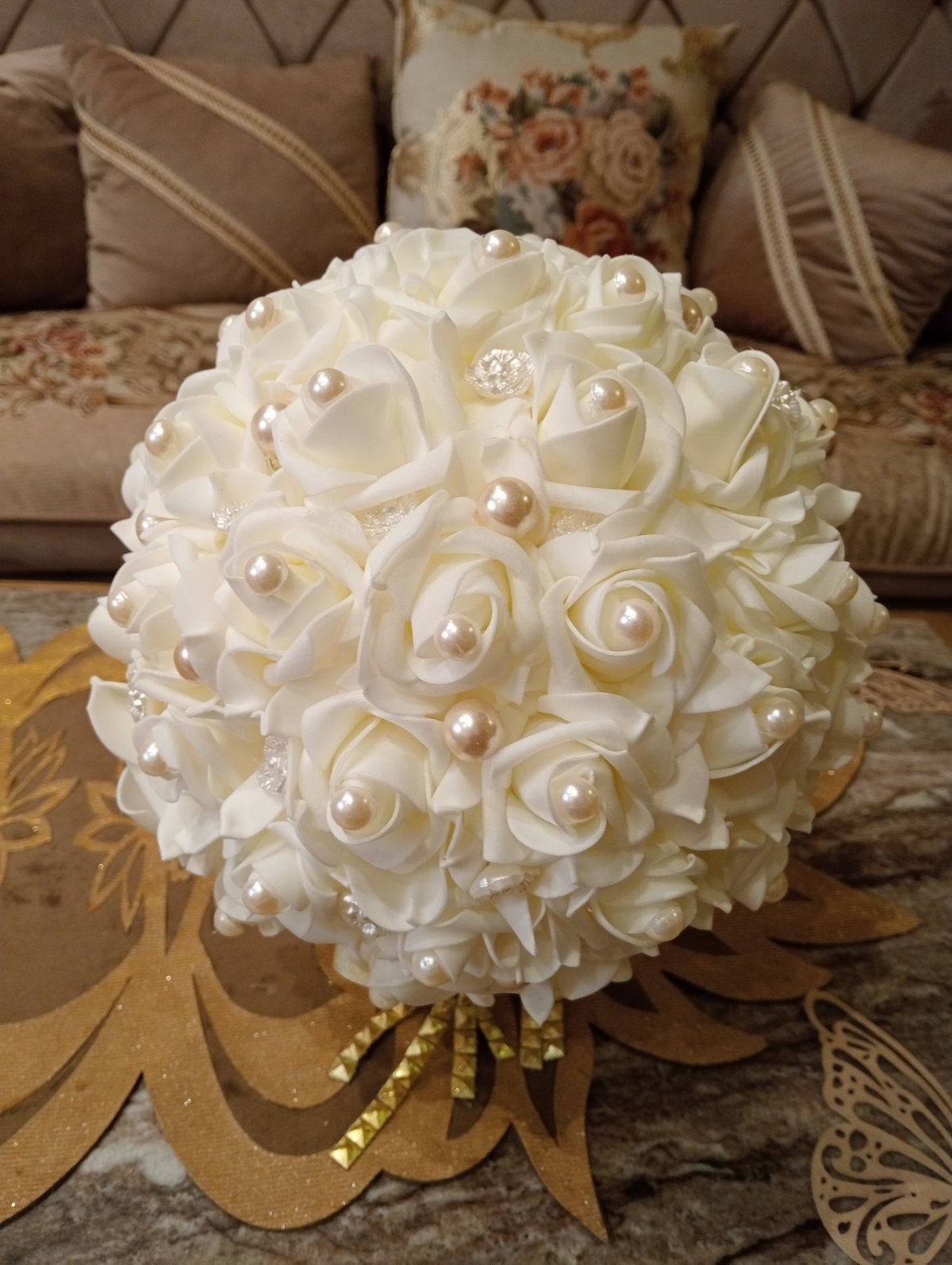 A bouquet of flowers for the bride,White and off-white fiber rose Decorated With acrylic pieces to highlight their beauty .