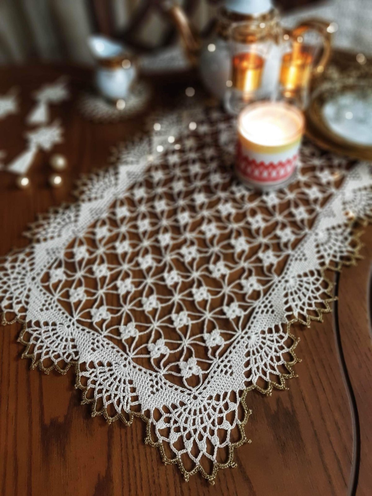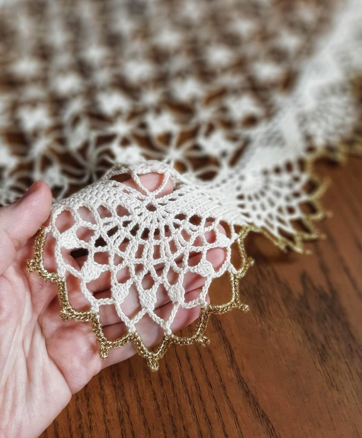 Crochet table runner with golden border by and cotton yarn 60 cm ×30cm