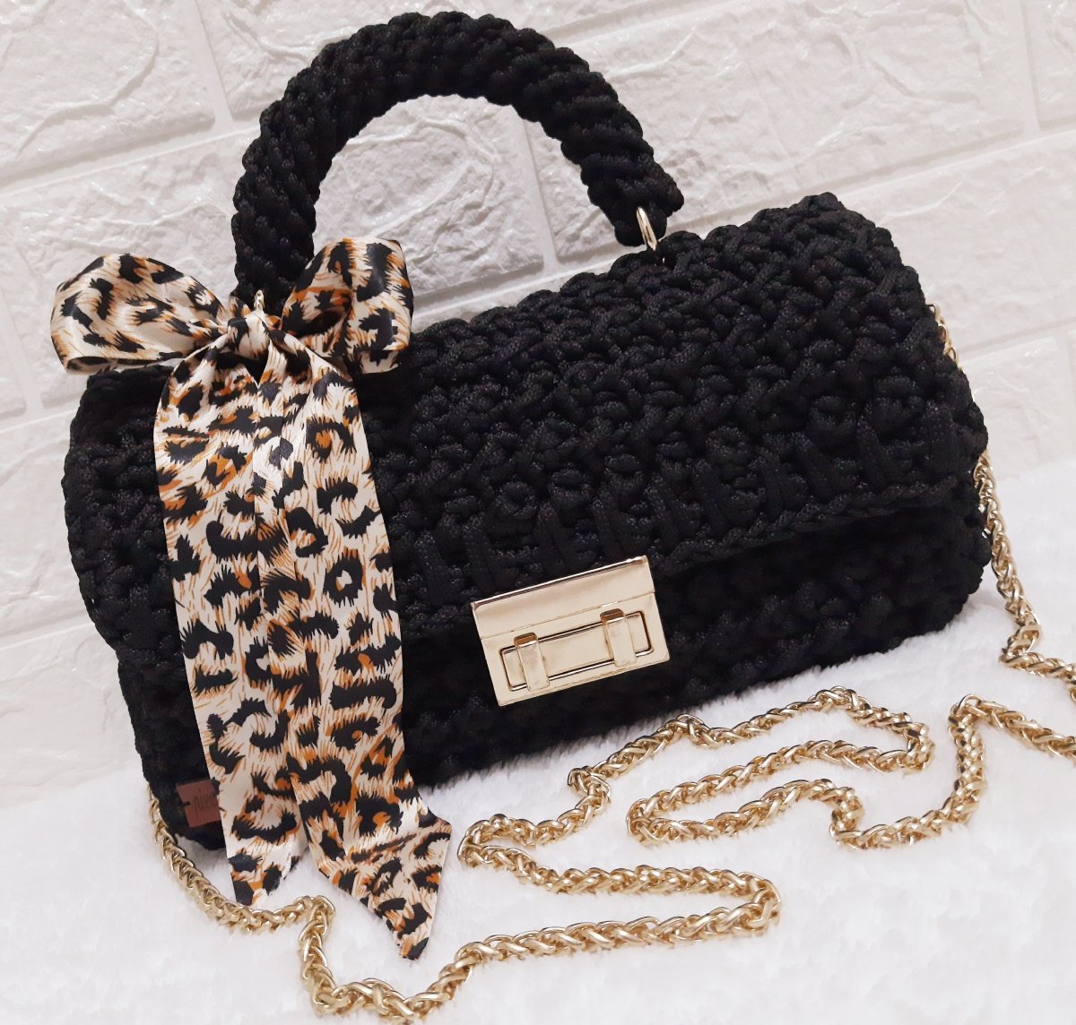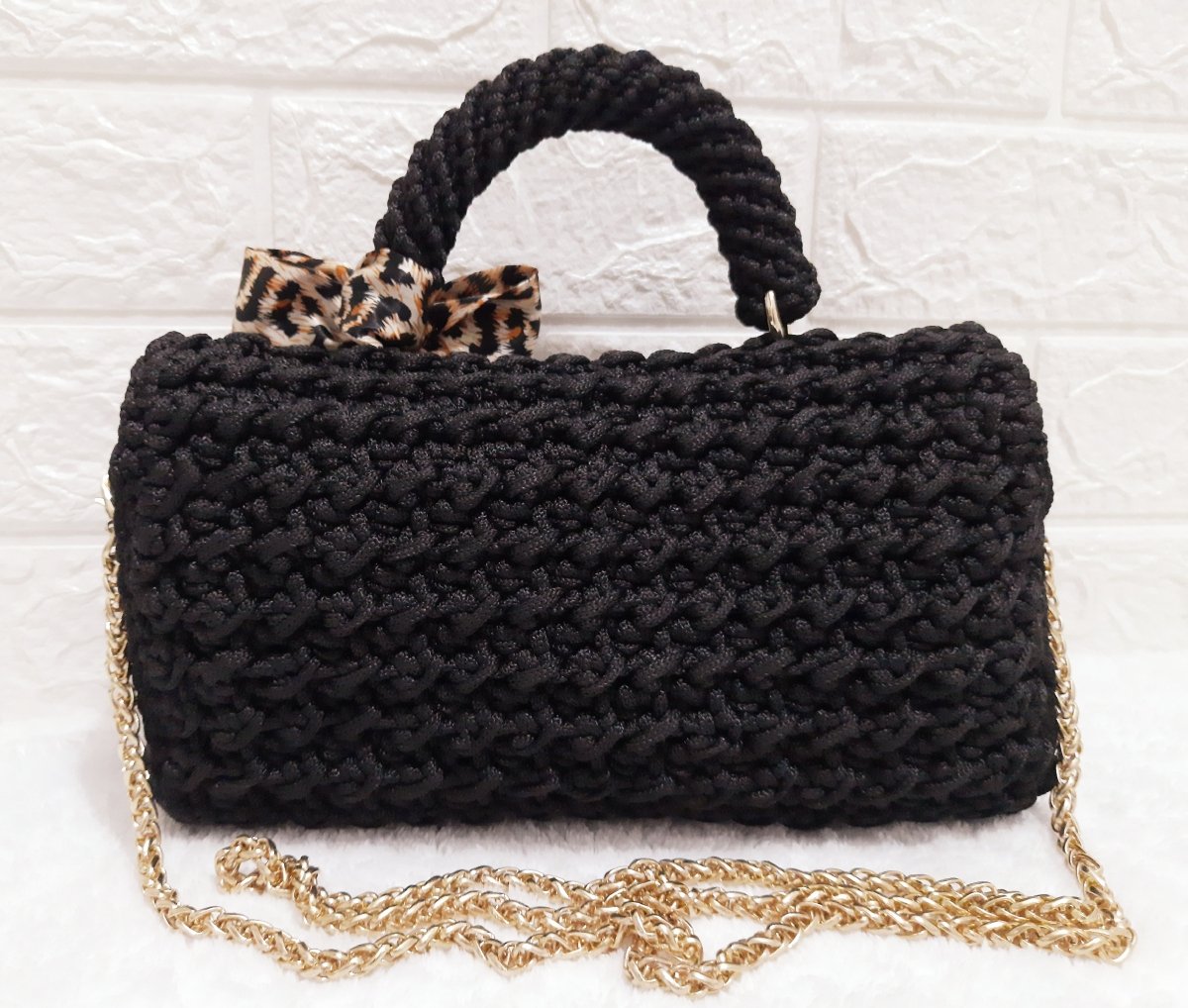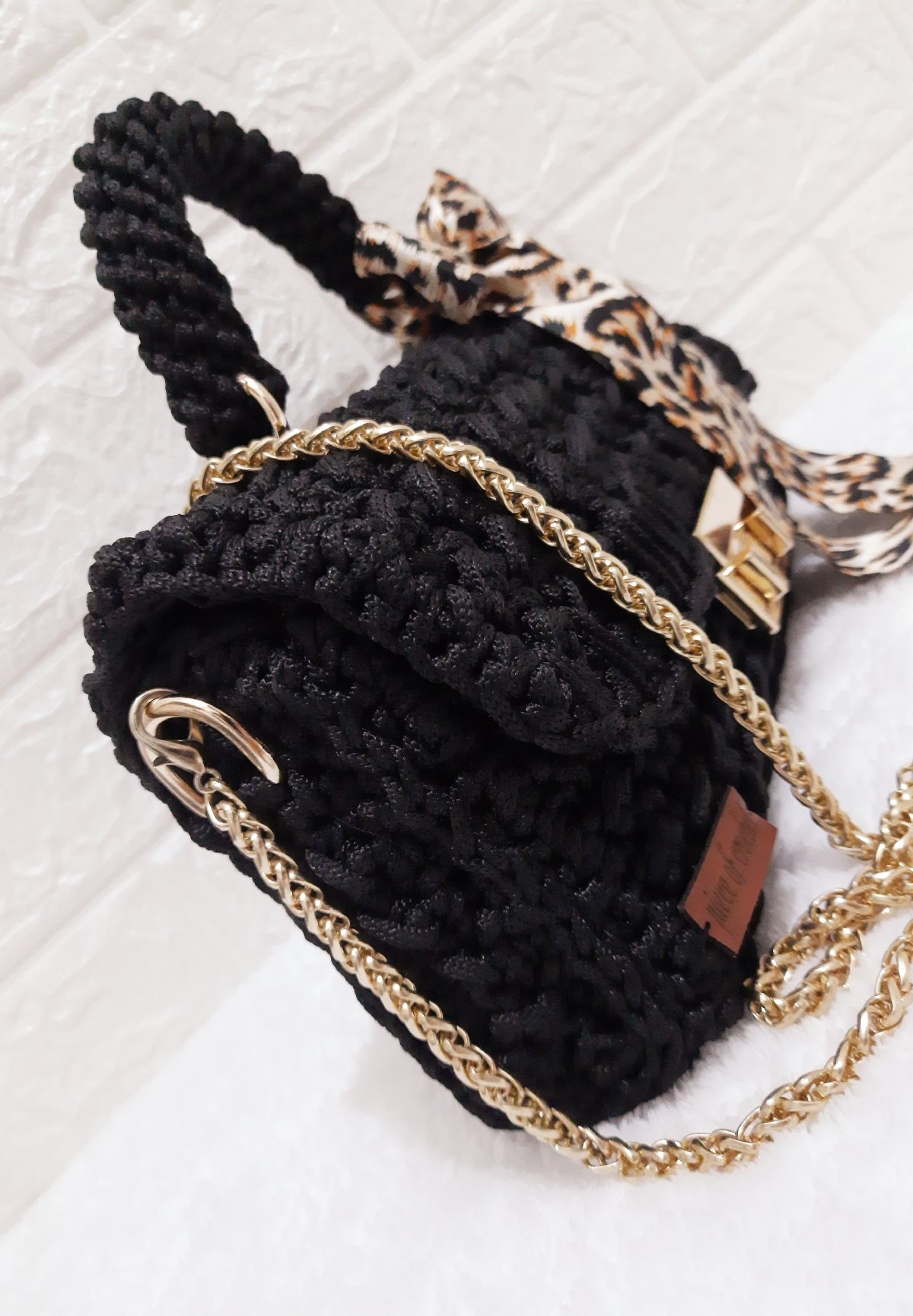 Crochet bag made of polyester thread, excellent quality It has gold accessories that can be changed upon request Lined on the inside and has a chain handle