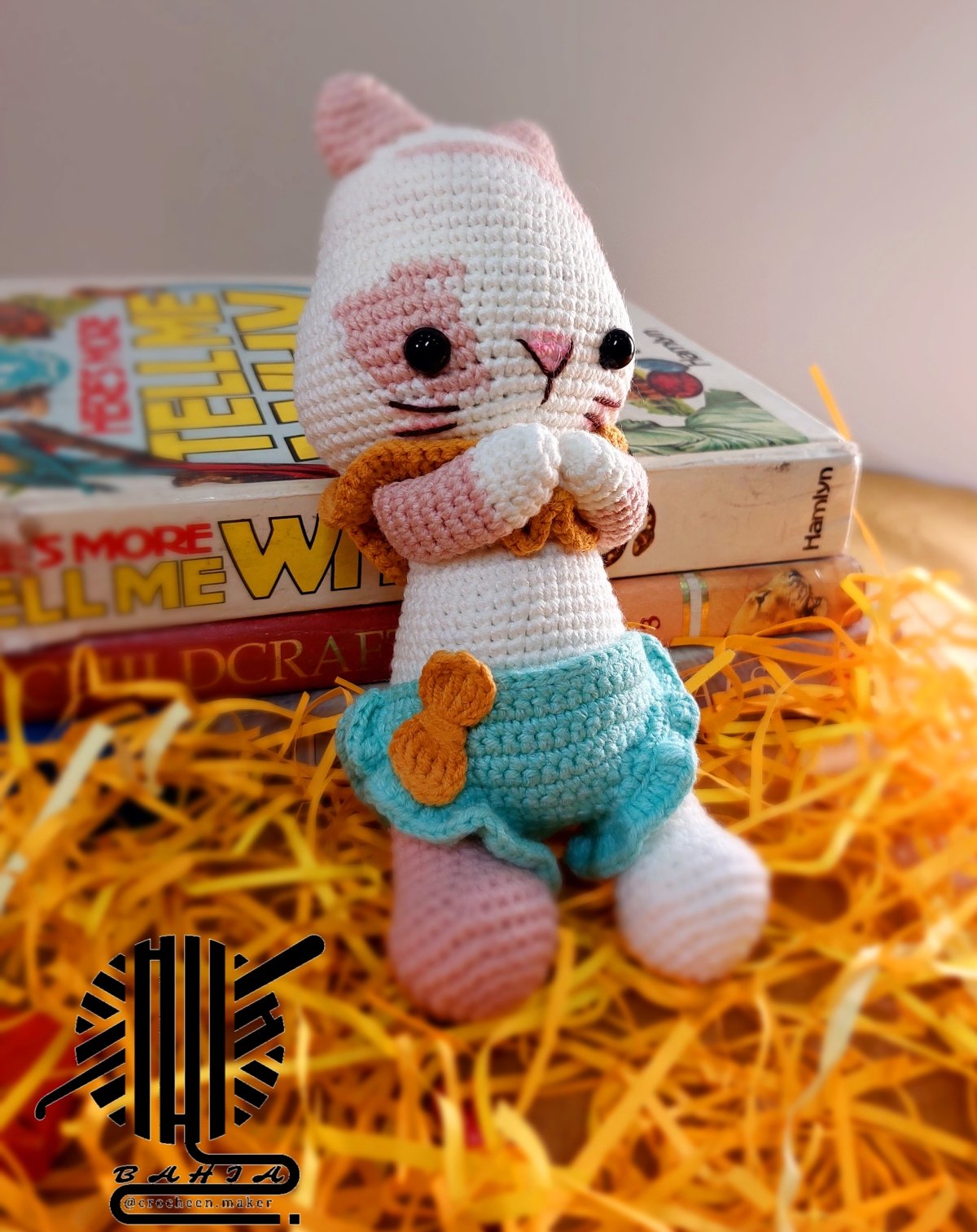 Amigurumi cat with cotton yarn and safty eyes ,seperated pants