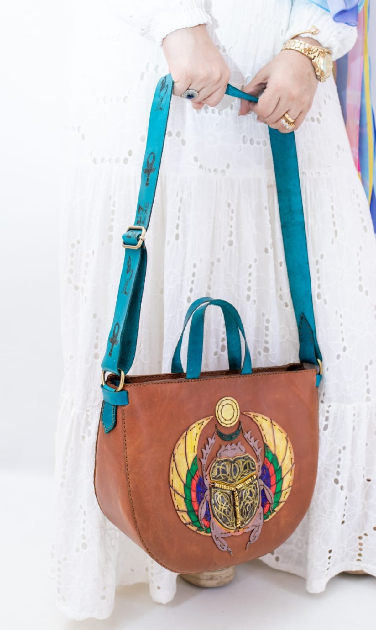 Material: Pull-up Crazy Horse cowhide leather in two different colors. Design: Very deep on the inside, making it ideal for daily use. Flexibility in carrying: It can be used as a crossbody bag or shoulder bag thanks to the adjustable strap. Details: It contains prominent details of the Pharaonic scarab, made of High-quality natural leather in customized colors. Dimensions: width 35 cm, height 28 cm. This bag is distinguished by its unique design and high quality, which makes it an ideal addition for daily use and expresses the beauty of the Pharaonic heritage.