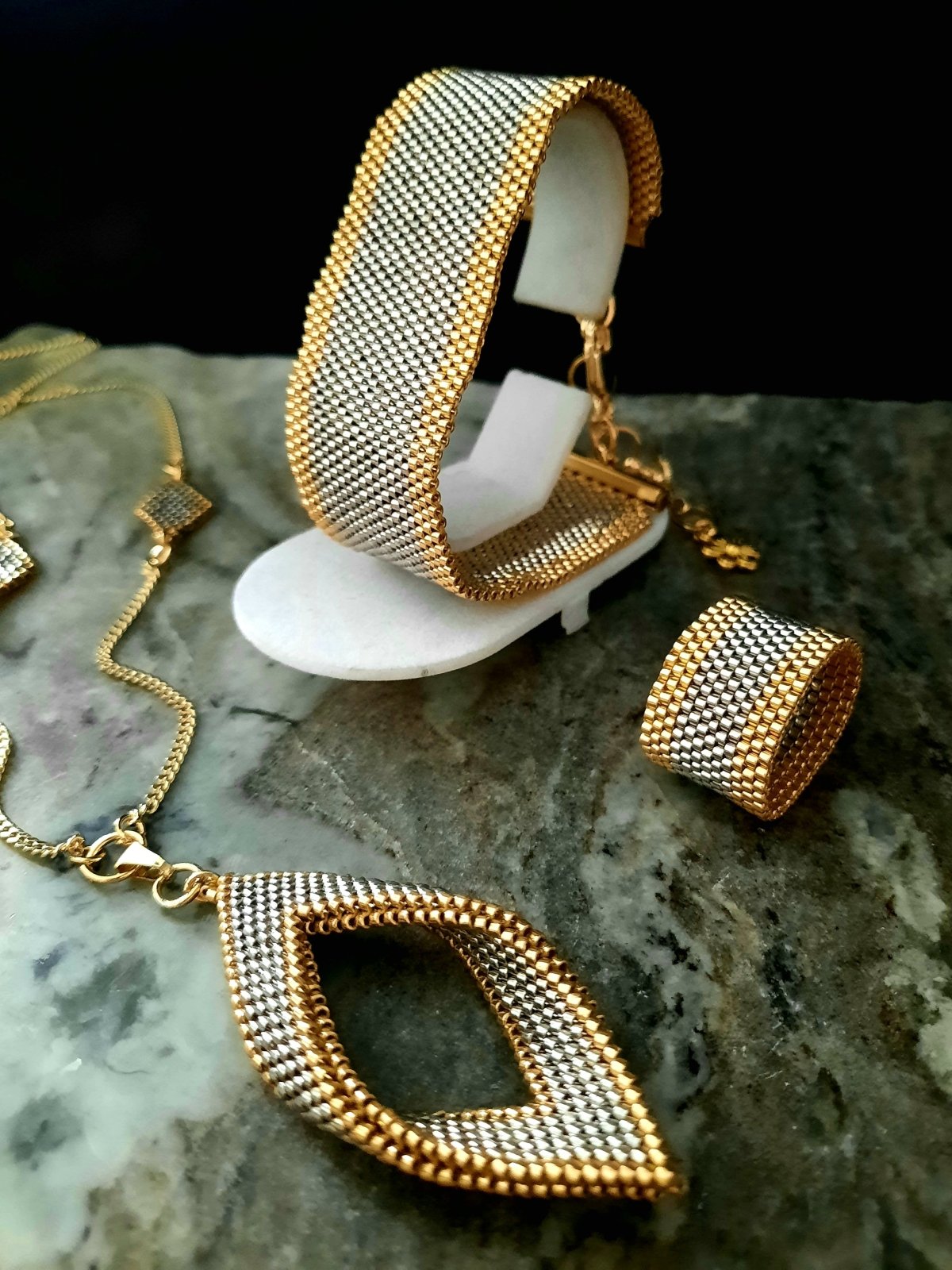 The set consists of a 60 cm long, extendable chain designed in the form of a leaf in silver with gold letters, in addition to small units in a mixture of the two colors to add a special magical touch. A bracelet and a ring in the same style also in silver with gold letters. Made entirely of Japanese Miyuki beads. .. All metal materials used are not rusty or change color.. and do not cause allergies.. the weight is very light..