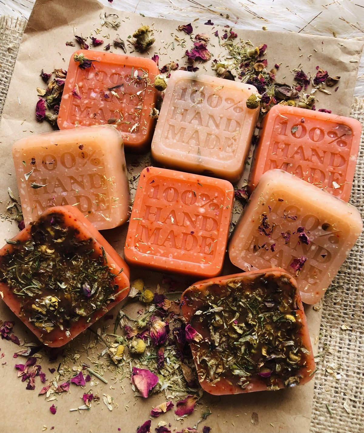 A mix of natural oils, including rose oil, sweet almond, and herbs, including chamomile and rose petals