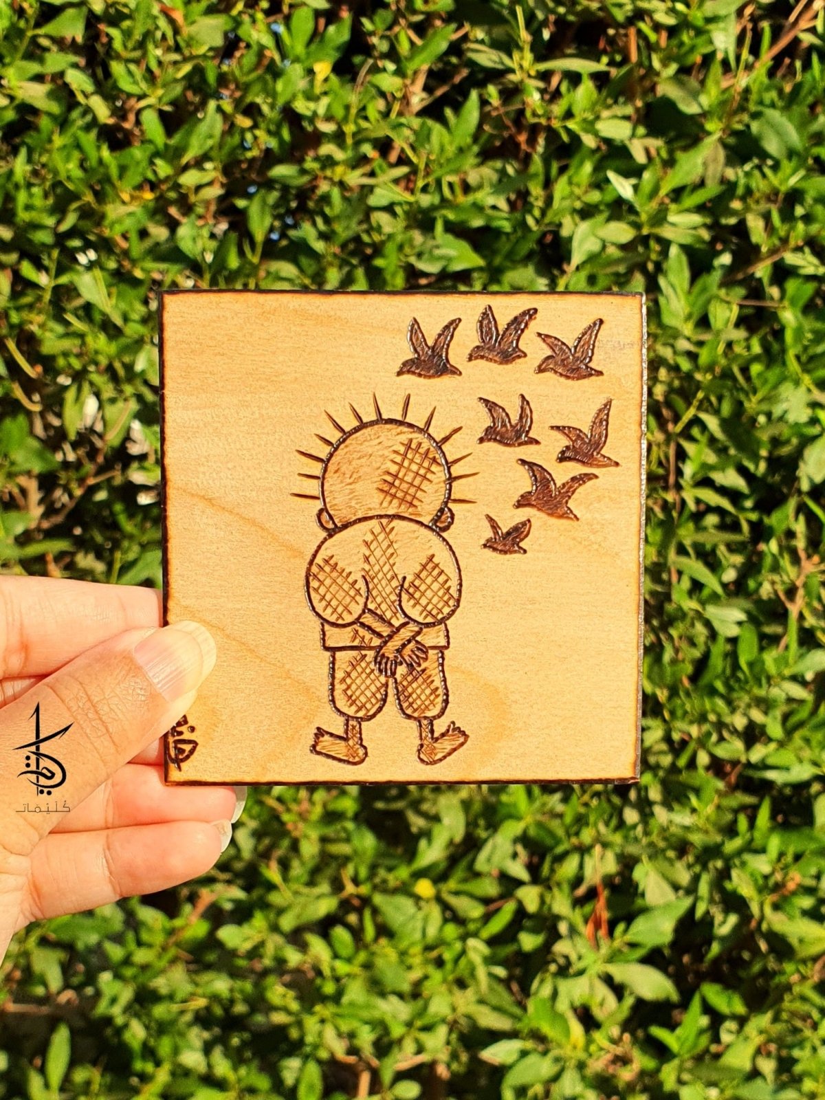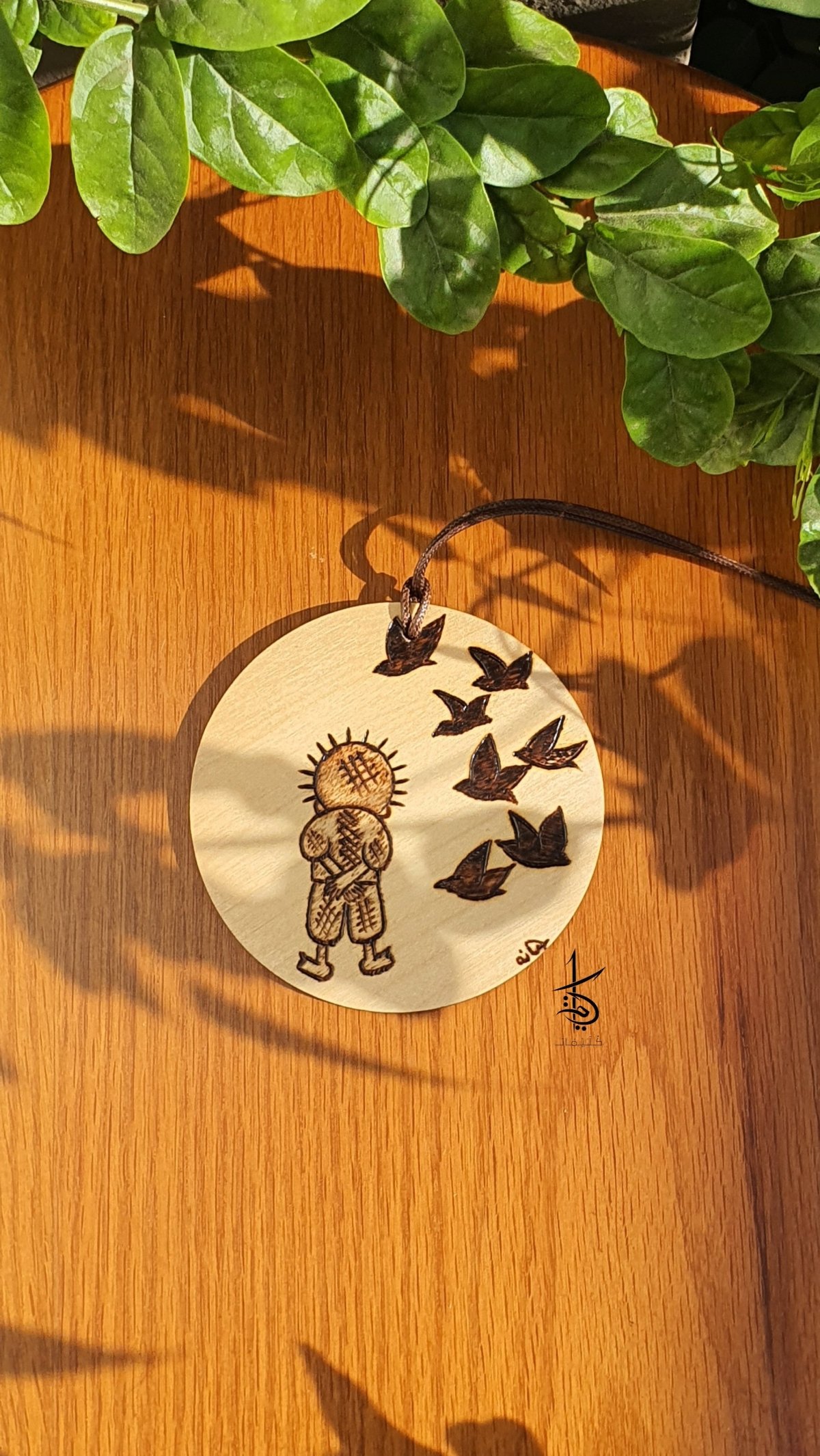 A special hand-burned wooden coaster to decorate your table or be hanged in your car.