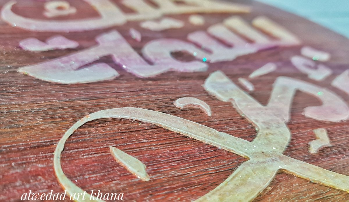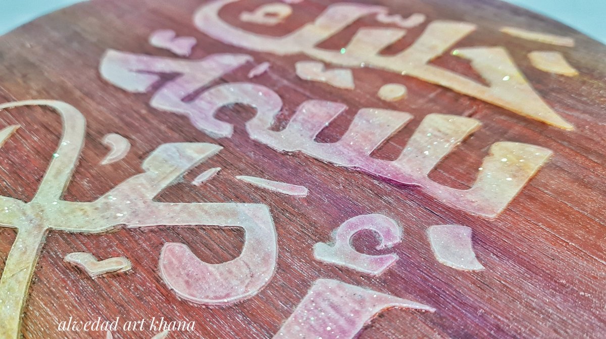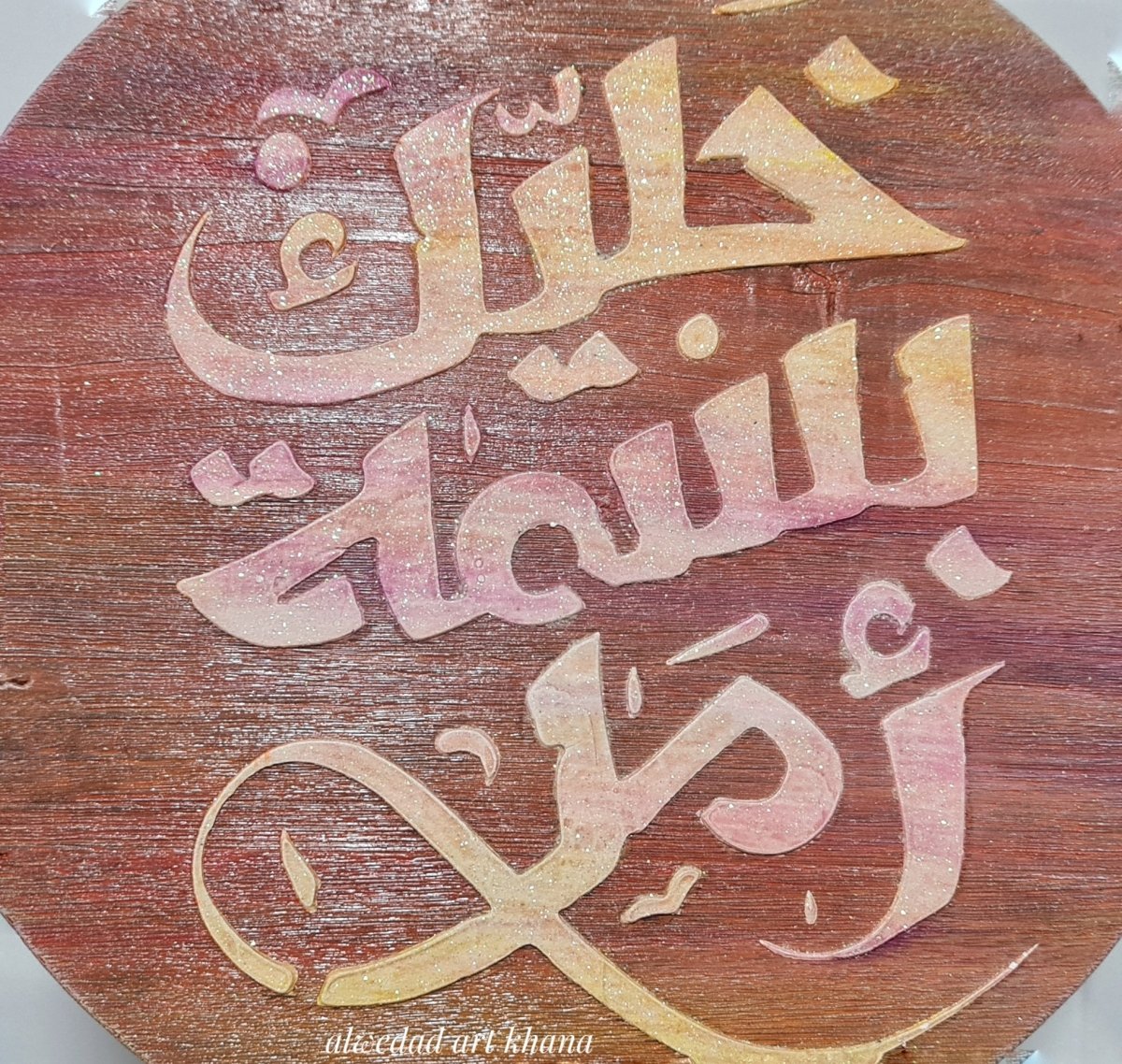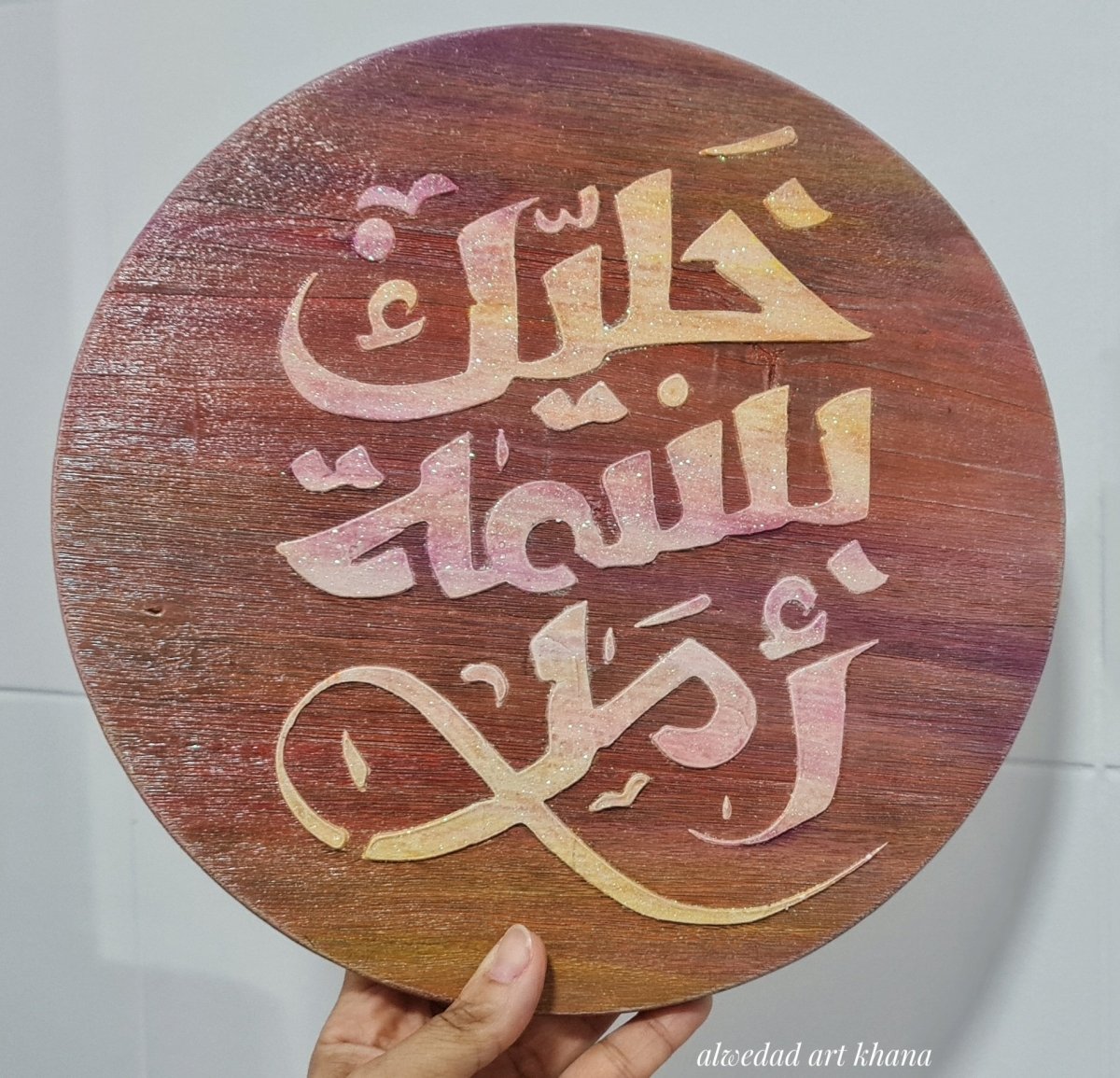 Natural wood tableau 30cm diameter Writing with white glitter colour Only one & unique piece