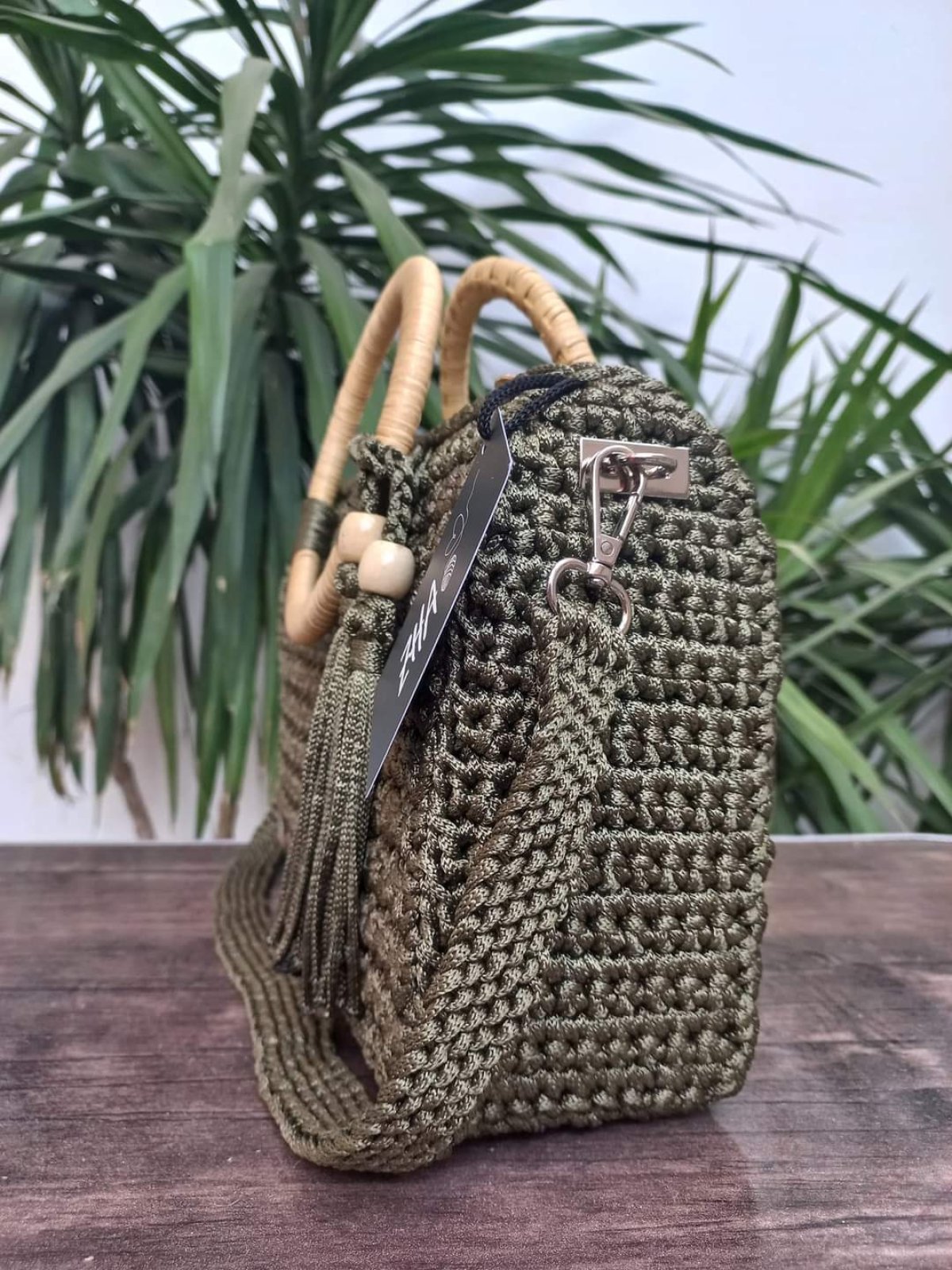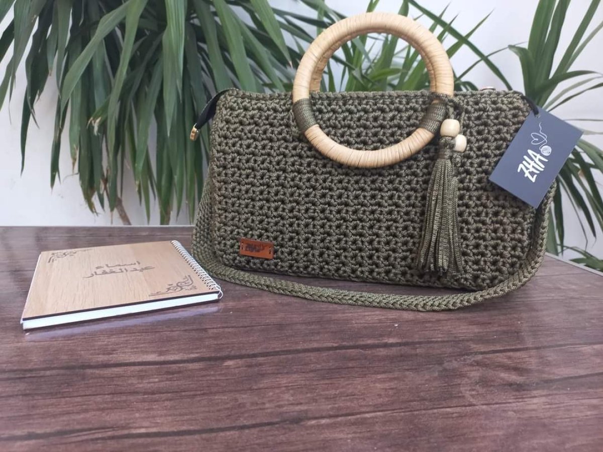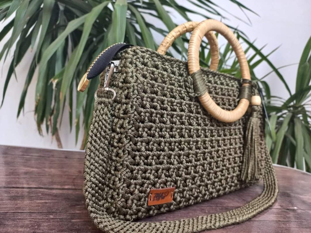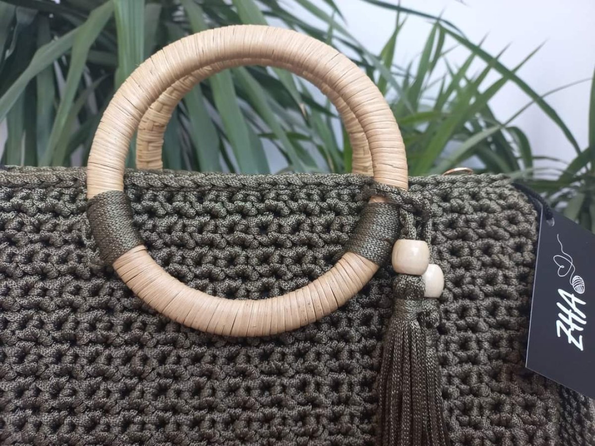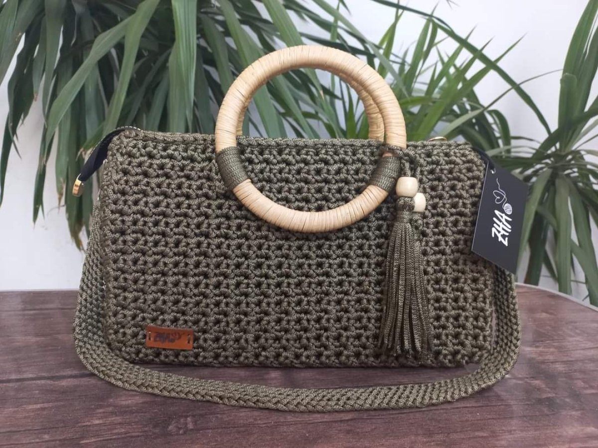 Crochet bag made of chain thread with Turkish bamboo wood and lined inside with a cotton lining with an internal pocket and a zipper to close the bag. The size of the bag is 34 cm by 22 cm, depth 10 cm and planting length 90 cm.