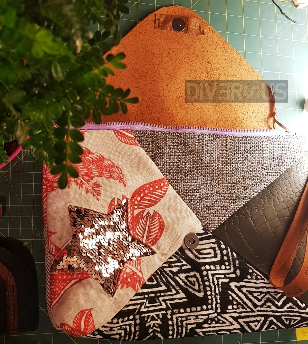 Genuine leather and fabric clutch bag with cotton lining and 1 inside pocket..35 ×23
