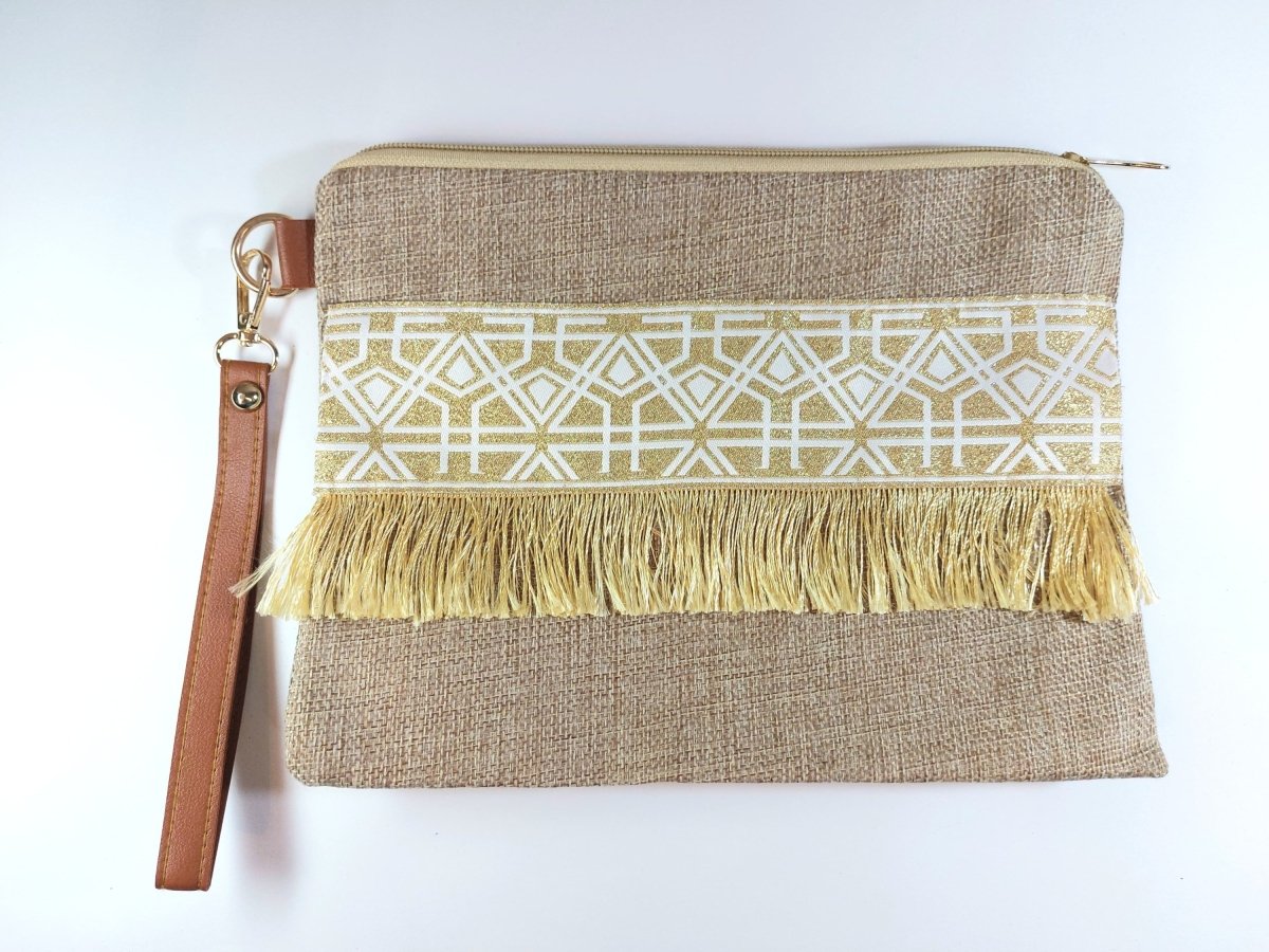 Linen clutch with Islamic ribbon and golden tassels. Lined from the inside. Zipper and handle on the side. Clutch size: 27 width x 20 length.