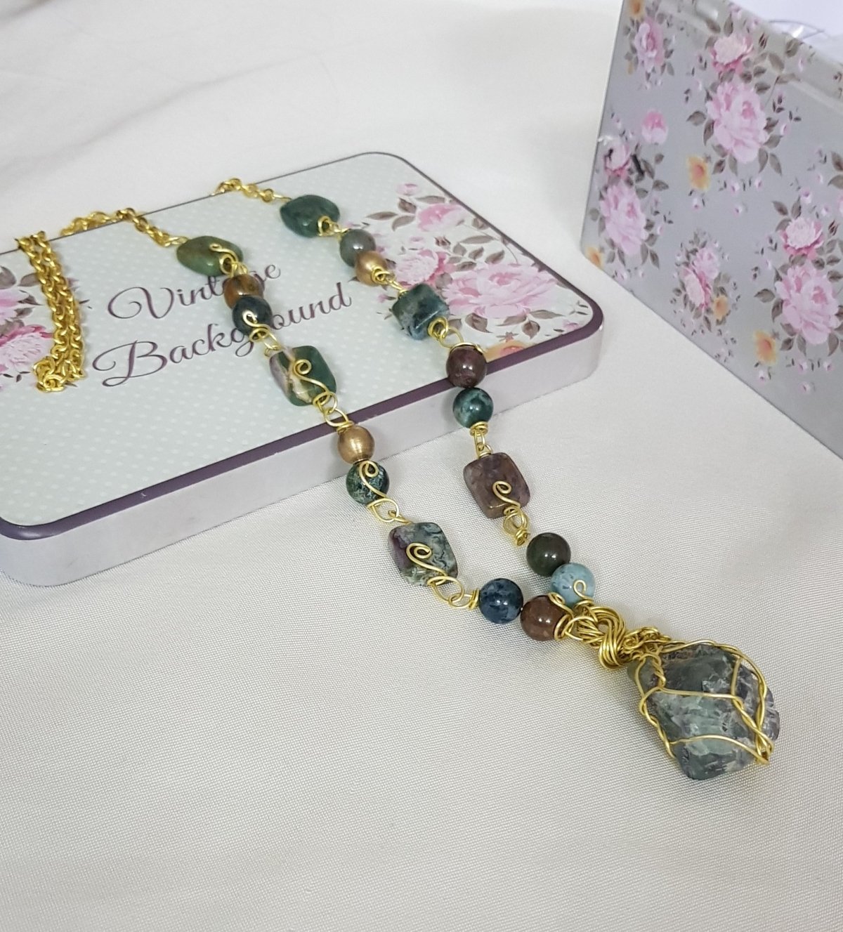 Green handmade copper necklace with flourite pendant and mousa Jade in the rest