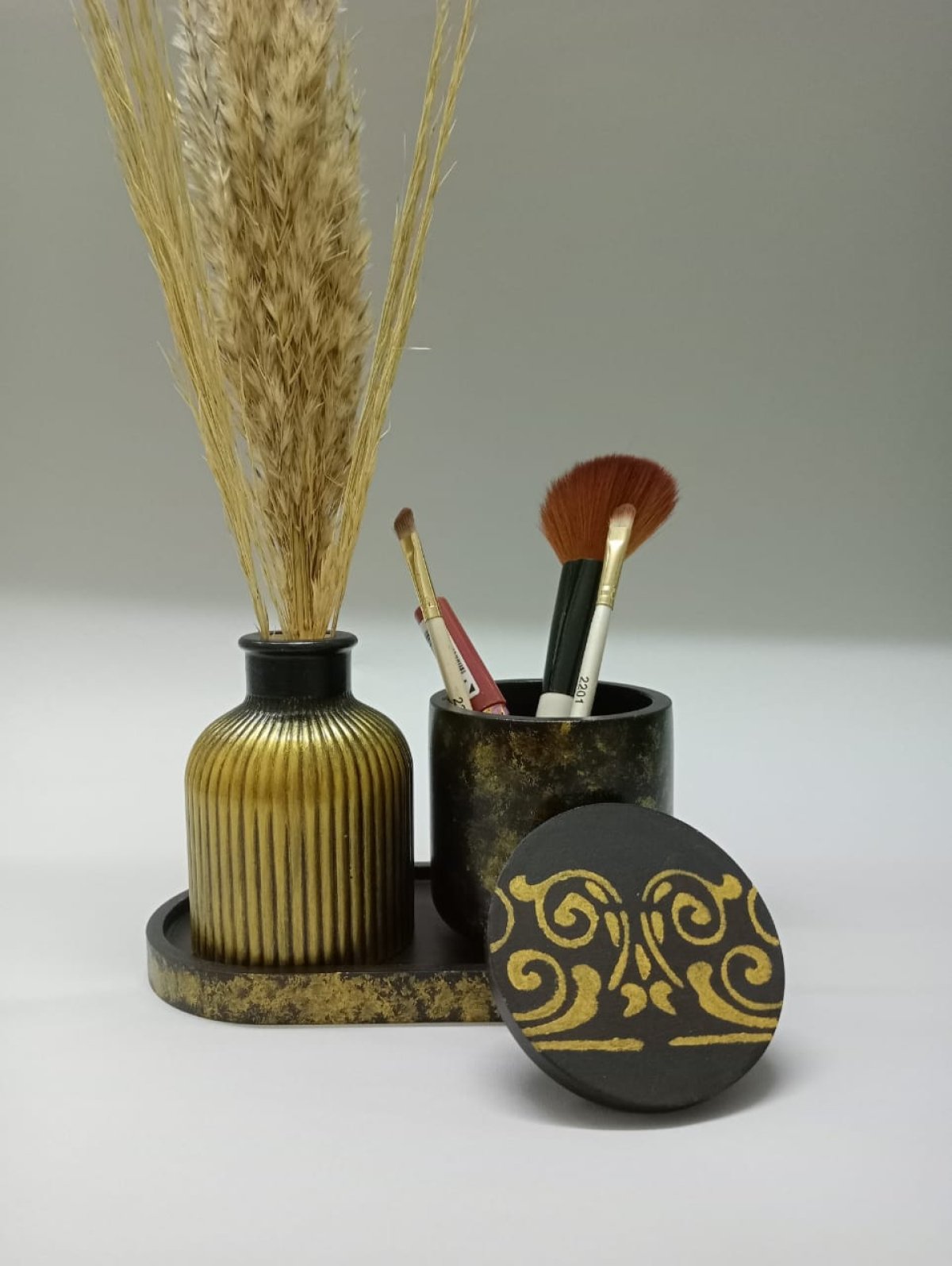 A black and gold inlaid concrete set, insulated with a layer of protection against water, consisting of an oval coaster, a ribbed vase, and a makeup cup.