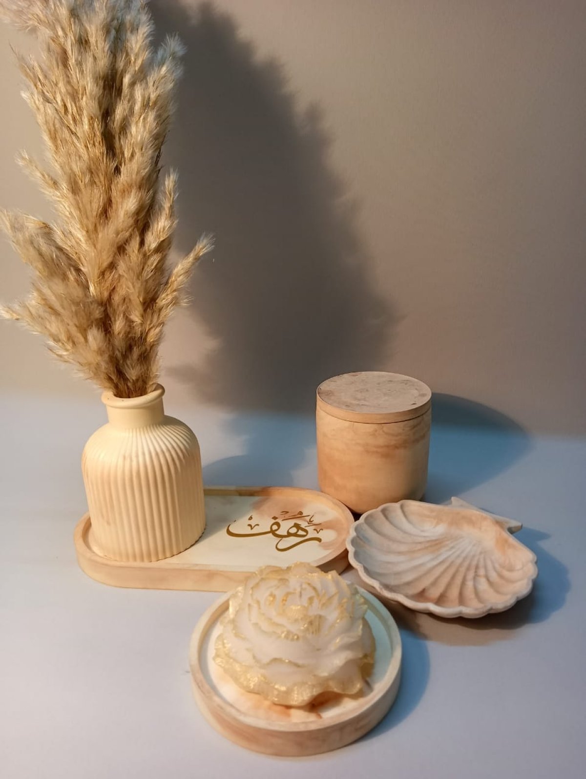 A beige and brown concrete set consisting of an oval coaster, a ribbed vase, a seashell coaster, and a makeup brush cup. Insulated with waterproof material. The set is available without candles. Available to write name upon customer request