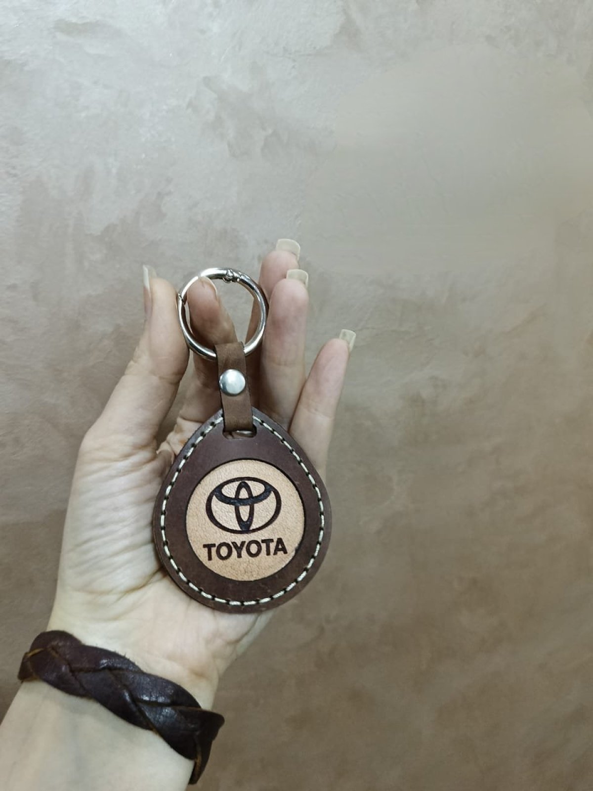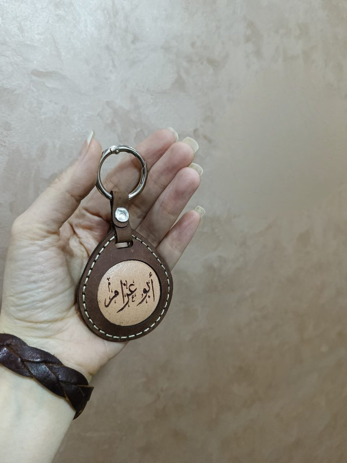 Entire cowhide leather medallion with a ring that facilitates opening. Height 10cm with ring and width 4cm